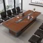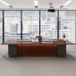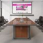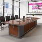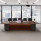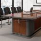 Thiết kế bàn gây ấn tượng bởi những đường nét thanh mảnh, các góc cạnh được bo cong mềm mại hoặc vát cạnh tinh xảo, xóa tan sự thô cứng của các dòng bàn họp truyền thống. Điểm chạm tinh tế nhất chính là hệ thống nắp hộp điện âm bàn đồng màu, được tích hợp phẳng mịn trên bề mặt, giúp kết nối công nghệ một cách duyên dáng và gọn gàng. Với sự phối hợp nhịp nhàng giữa tông màu gỗ tự nhiên và chân đế được tạo hình thanh thoát, chiếc bàn không chỉ là nơi làm việc mà còn là một tác phẩm nội thất đầy tính thẩm mỹ, khẳng định gu thẩm mỹ tinh xảo của doanh nghiệp.