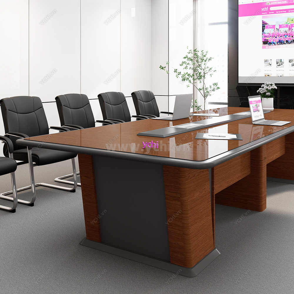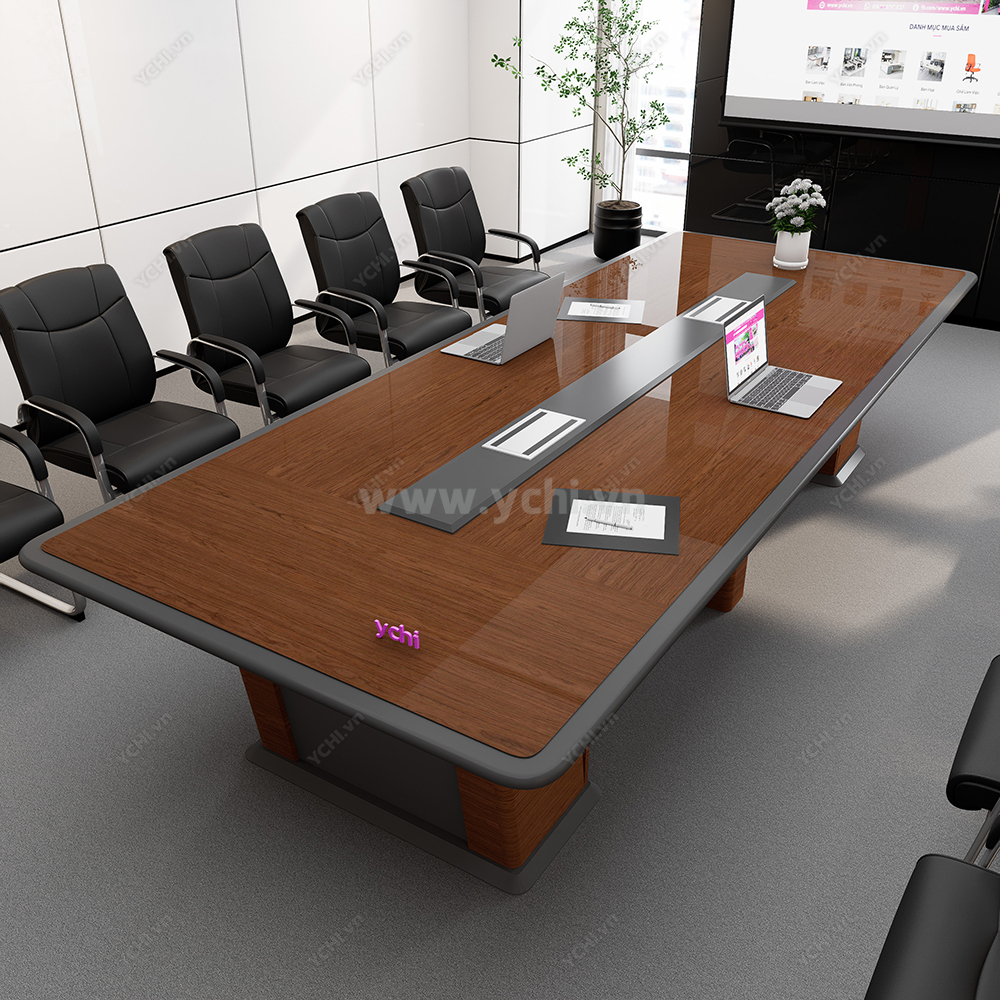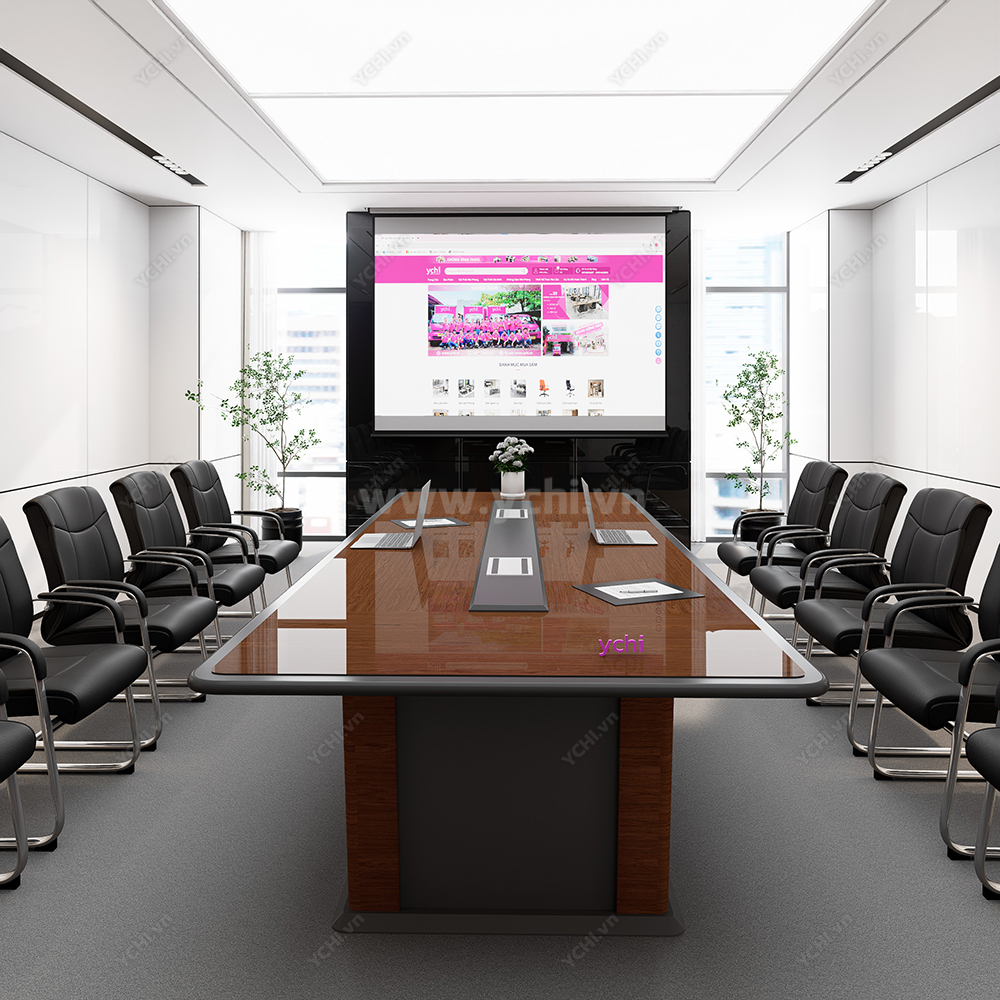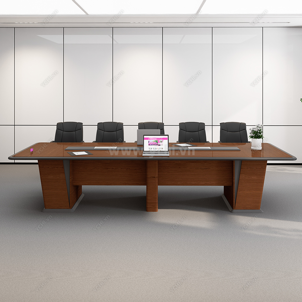 Trong kiến trúc nội thất văn phòng hạng sang, Bàn Họp YCHIMT091 là biểu tượng cho tầm vóc và sự thịnh vượng của doanh nghiệp. Sản phẩm gây ấn tượng mạnh mẽ nhờ sự kết hợp tinh tuyển giữa cốt gỗ MDF bền bỉ và lớp phủ Veneer gỗ tự nhiên cao cấp. Bề mặt bàn phô diễn những đường vân gỗ sống động, mang lại chiều sâu màu sắc trung thực cùng độ bóng mờ quý phái, tạo nên một không gian hội nghị vừa uy quyền, vừa ấm cúng.