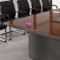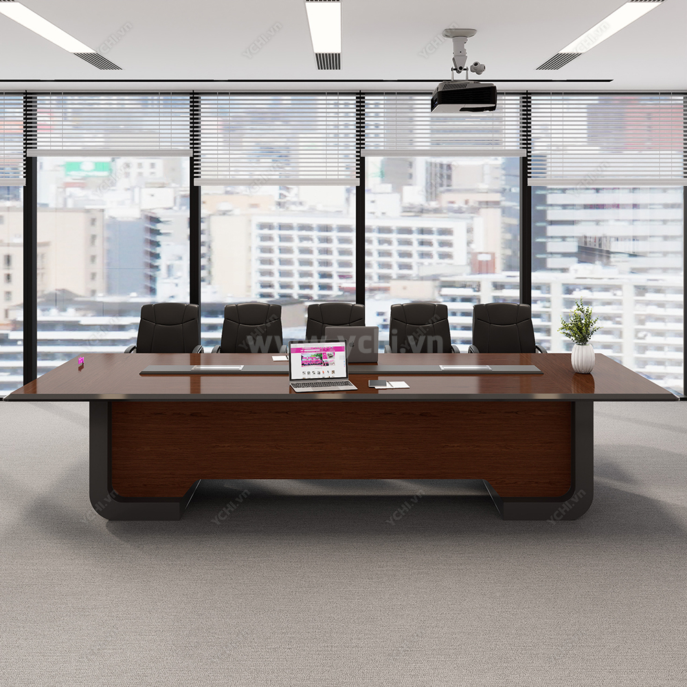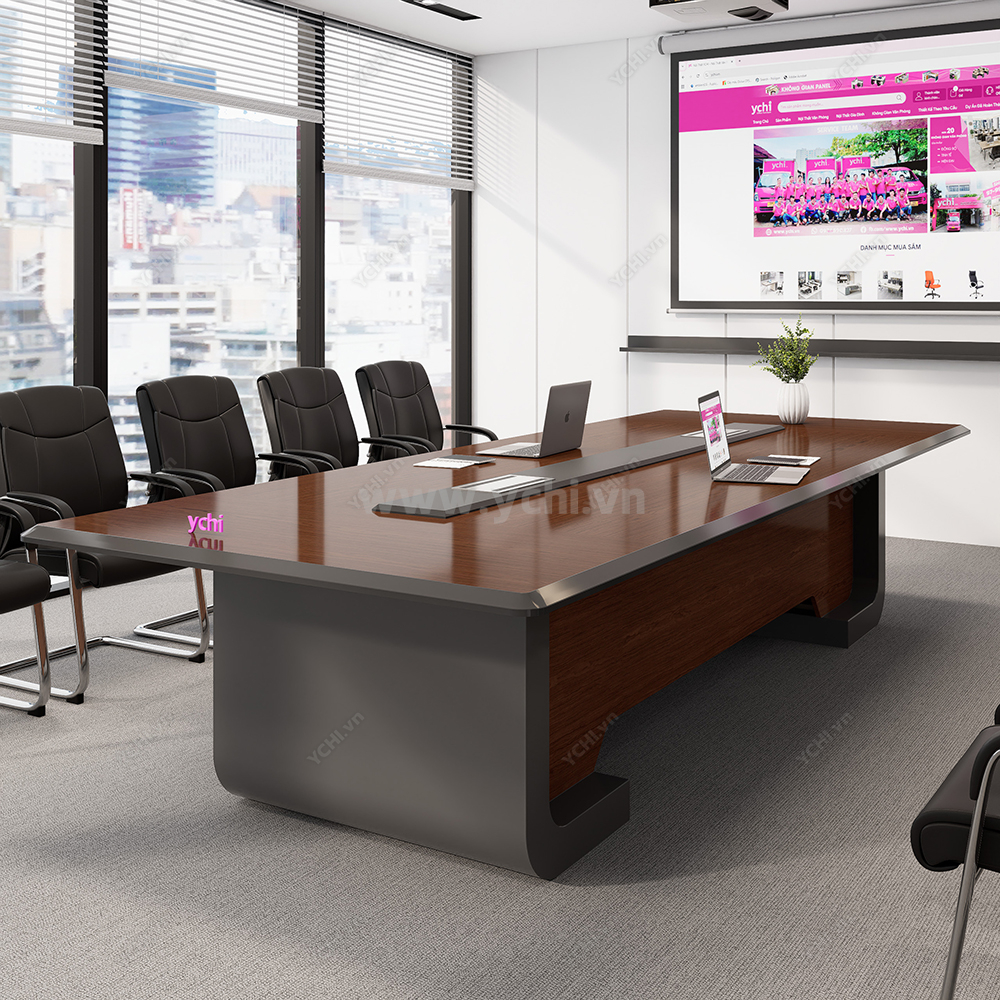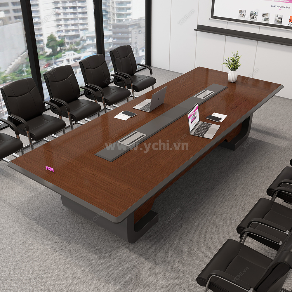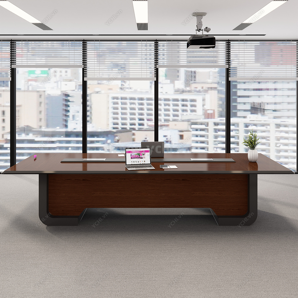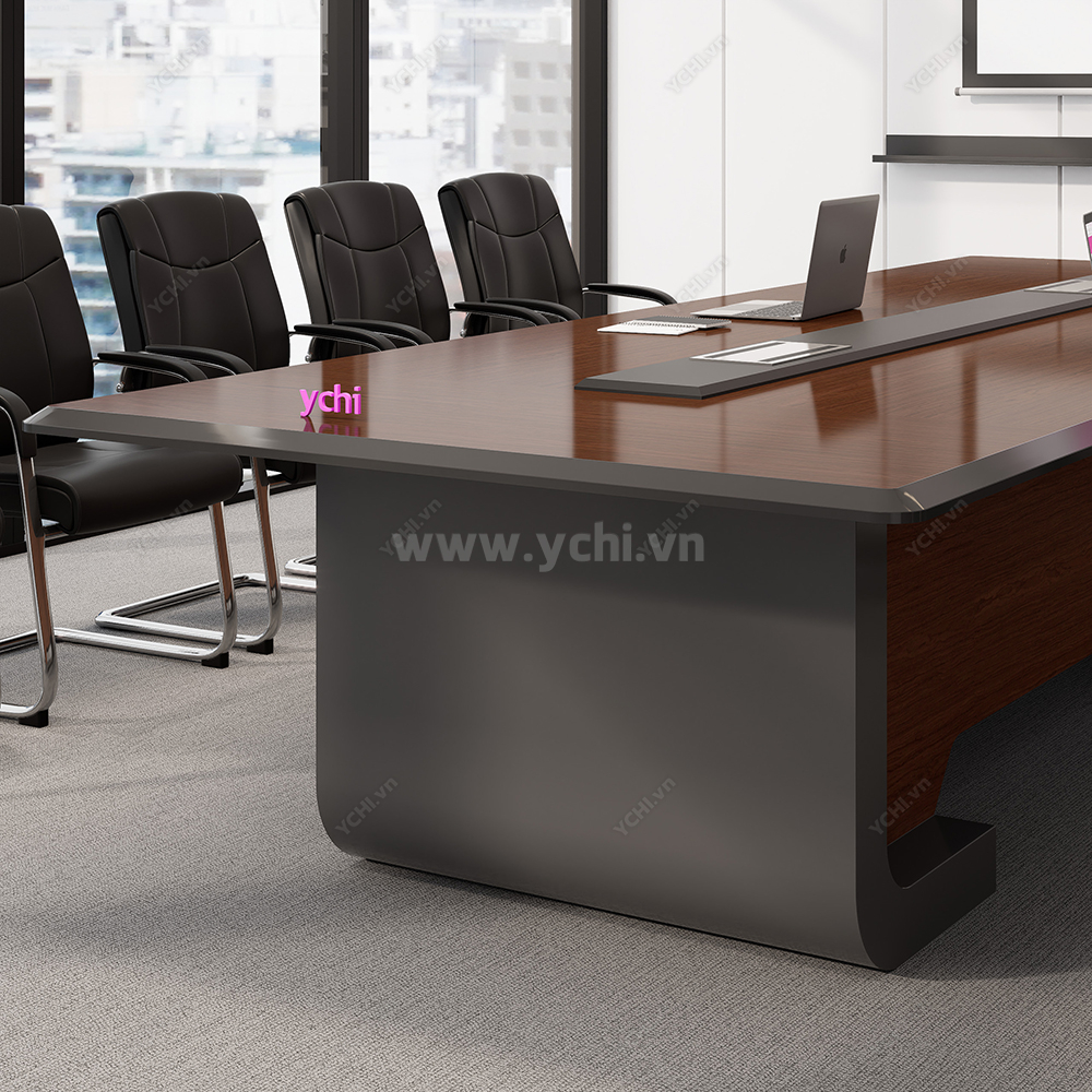 Thiết kế gây ấn tượng bởi những đường nét thanh thoát, mặt bàn đại bản được vát cạnh mềm mại hoặc bo cong nhẹ nhàng, xóa tan sự thô cứng của nội thất văn phòng truyền thống. Điểm chạm thông minh nằm ở hệ thống máng điện âm bàn đồng màu được tích hợp phẳng mịn, giúp kết nối công nghệ một cách duyên dáng và gọn gàng. Với sự phối hợp nhịp nhàng giữa tông màu gỗ tự nhiên và chân đế khối được tạo hình tối giản, chiếc bàn không chỉ là nơi hội họp mà còn là một tác phẩm nội thất nghệ thuật, khẳng định gu thẩm mỹ thanh lịch và chuyên nghiệp của doanh nghiệp.