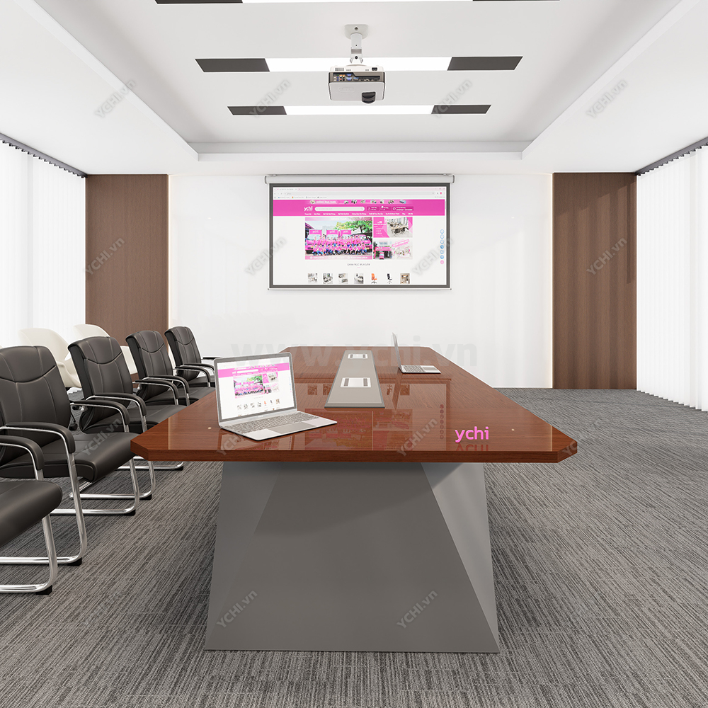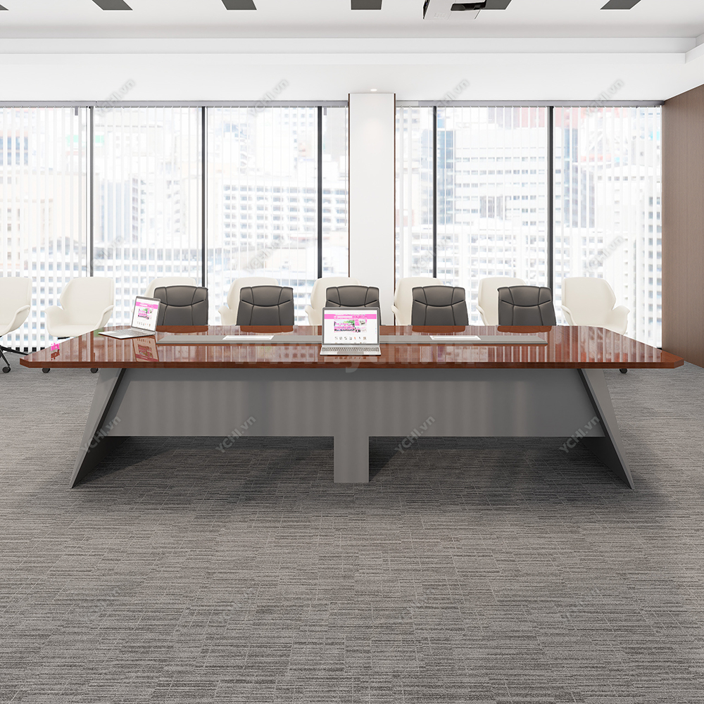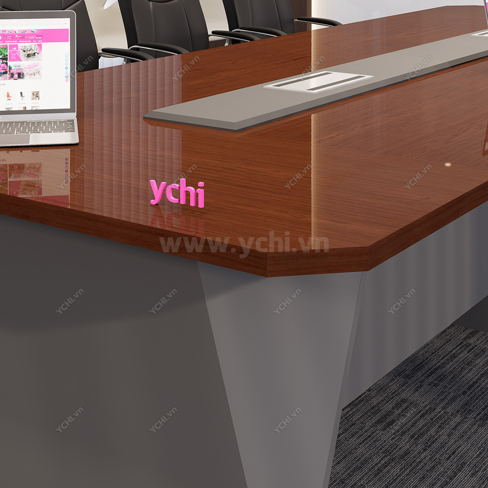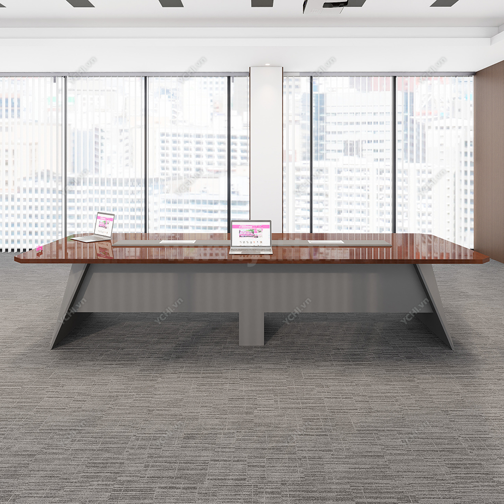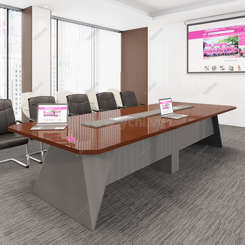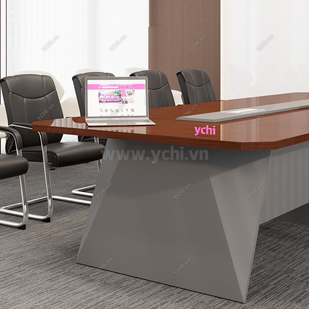 Bàn Họp Vân Gỗ Tự Nhiên YCHIMT104 hiện đại với thiết kế tinh tế và đẳng cấp. Mặt bàn được chế tác từ chất liệu MDF phủ veneer vân gỗ tự nhiên, mang lại vẻ đẹp sang trọng và ấm cúng cho không gian hội họp. Màu nâu đỏ của veneer vân gỗ kết hợp với màu xám của chân bàn tạo nên sự hài hòa và tinh tế. Bàn có kích thước rộng rãi, đủ chỗ cho nhiều người ngồi, phù hợp với các cuộc họp, hội thảo, thuyết trình. Chân bàn được thiết kế chắc chắn, vững chãi, đảm bảo an toàn và ổn định khi sử dụng. Bàn còn được trang bị đầy đủ tiện ích như ổ cắm điện, cổng kết nối (nếu được yêu cầu), giúp các cuộc họp diễn ra suôn sẻ và hiệu quả. Sản phẩm này không chỉ là một chiếc bàn họp thông thường mà còn là điểm nhấn thẩm mỹ tuyệt vời cho không gian văn phòng, thể hiện sự chuyên nghiệp và đẳng cấp của doanh nghiệp.