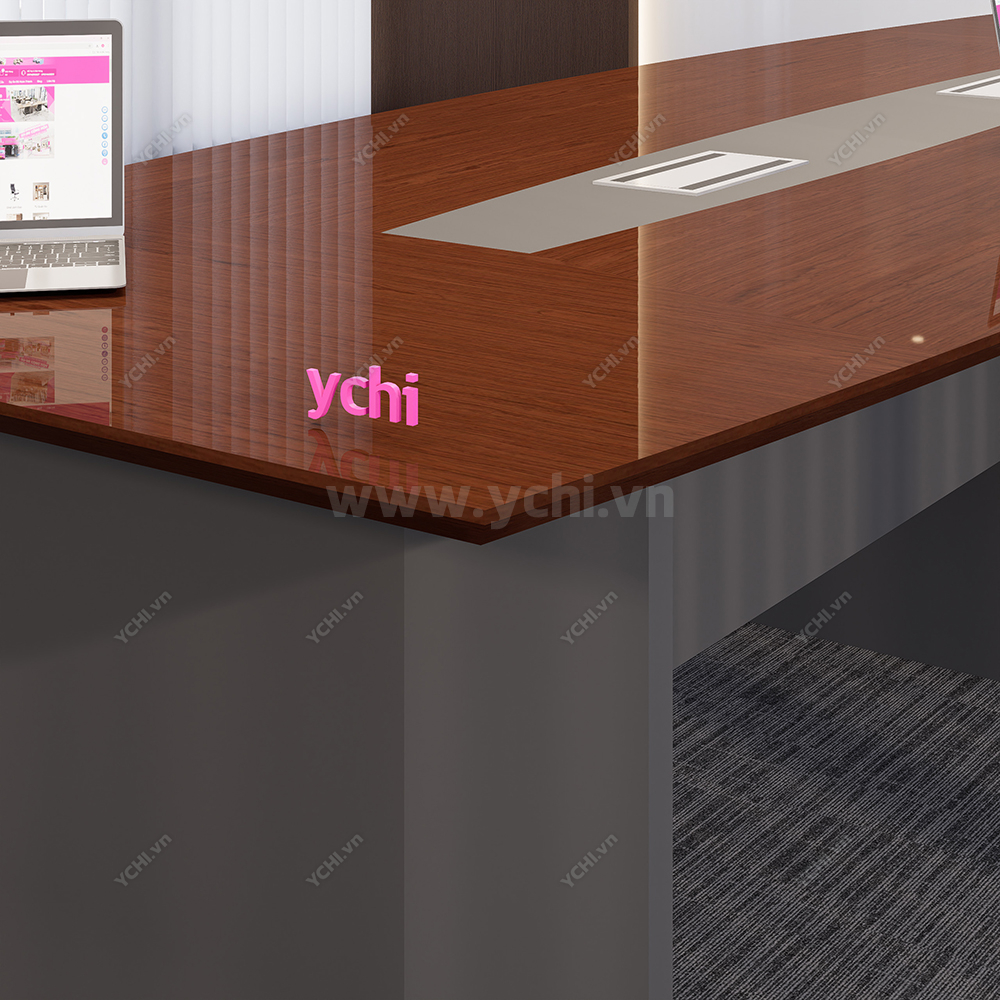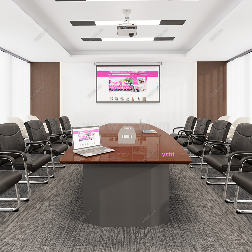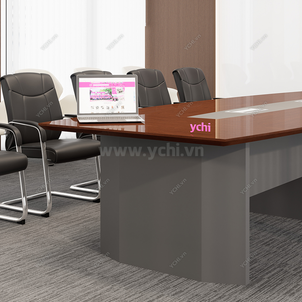 Nâng tầm giá trị thẩm mỹ cho phòng hội nghị với mẫu Bàn Họp Vân Gỗ Tự Nhiên YCHIMT108 mang phong cách kiến trúc hiện đại, nơi mỗi đường nét đều toát lên sự tinh tế và đẳng cấp. Điểm nhấn trung tâm nằm ở mặt bàn được chế tác từ cốt gỗ MDF bền bỉ, bao phủ bởi lớp Veneer vân gỗ tự nhiên với sắc nâu đỏ sang trọng. Độ bóng gương nhẹ trên bề mặt không chỉ tôn vinh các đường vân gỗ uyển chuyển mà còn tạo nên hiệu ứng thị giác mở rộng, mang lại sự khoáng đạt cho không gian làm việc. Điểm độc đáo của phiên bản này chính là hệ thống chân trụ được thiết kế theo dạng khối hình học vát cạnh đầy táo bạo. Sự kết hợp giữa mảng màu xám chì (charcoal) mạnh mẽ của chân bàn và tông gỗ ấm nồng tạo nên một sự tương phản đầy tính nghệ thuật. Thiết kế chân bàn dạng khối lớn không chỉ mang lại sự vững chãi tuyệt đối mà còn khơi gợi cảm giác về sự kiên định và bền vững của doanh nghiệp. Từng góc cạnh của bàn được gia công tỉ mỉ, bo nhẹ đầy tinh tế, đảm bảo sự an toàn và tạo cảm giác mềm mại hơn cho tổng thể hình khối bề thế. Đây không đơn thuần là nơi thảo luận công việc, mà là một không gian truyền cảm hứng, nơi những chiến lược đột phá được hình thành trong một môi trường nội thất cao cấp, sang trọng và chuyên nghiệp chuẩn mực.