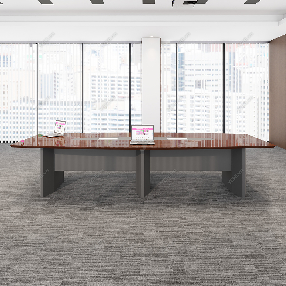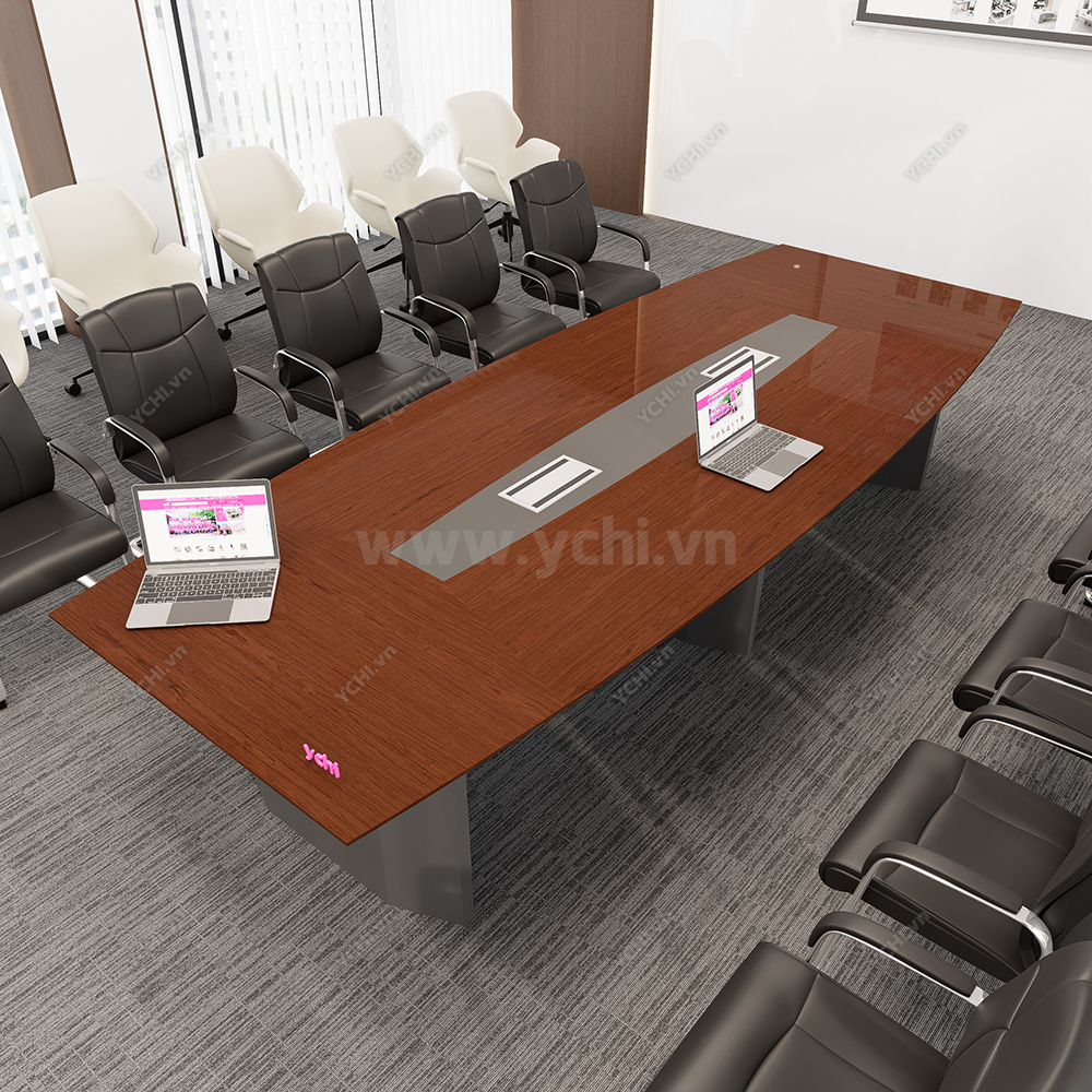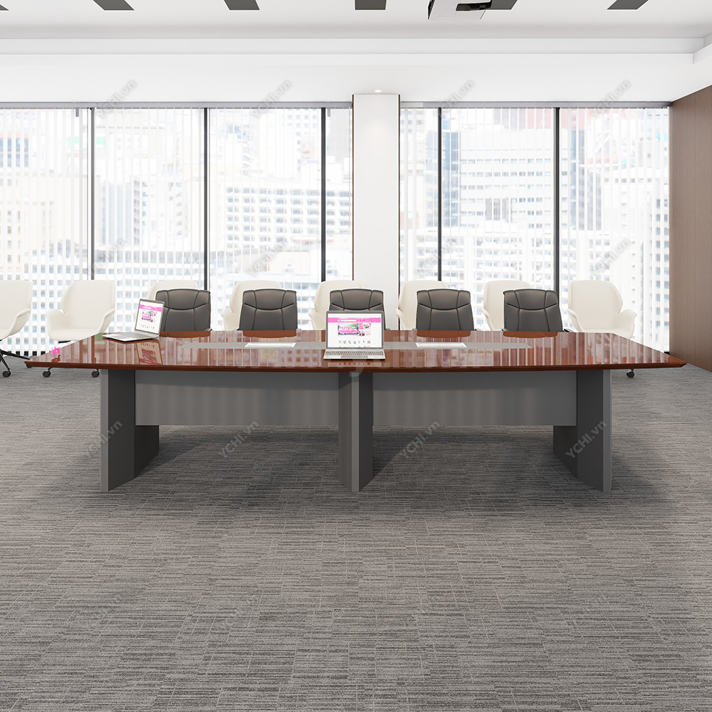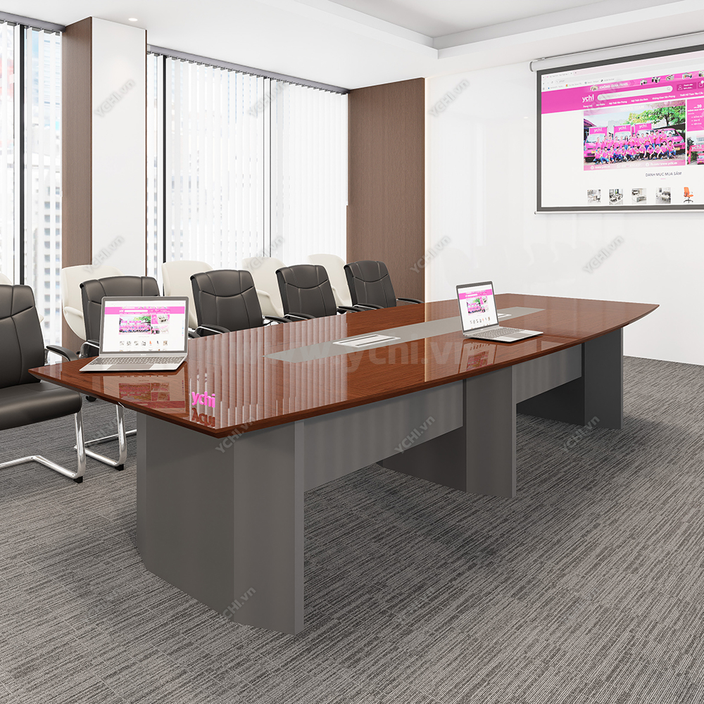 Nâng tầm giá trị thẩm mỹ cho phòng hội nghị với mẫu Bàn Họp Vân Gỗ Tự Nhiên YCHIMT108 mang phong cách kiến trúc hiện đại, nơi mỗi đường nét đều toát lên sự tinh tế và đẳng cấp. Điểm nhấn trung tâm nằm ở mặt bàn được chế tác từ cốt gỗ MDF bền bỉ, bao phủ bởi lớp Veneer vân gỗ tự nhiên với sắc nâu đỏ sang trọng. Độ bóng gương nhẹ trên bề mặt không chỉ tôn vinh các đường vân gỗ uyển chuyển mà còn tạo nên hiệu ứng thị giác mở rộng, mang lại sự khoáng đạt cho không gian làm việc. Điểm độc đáo của phiên bản này chính là hệ thống chân trụ được thiết kế theo dạng khối hình học vát cạnh đầy táo bạo. Sự kết hợp giữa mảng màu xám chì (charcoal) mạnh mẽ của chân bàn và tông gỗ ấm nồng tạo nên một sự tương phản đầy tính nghệ thuật. Thiết kế chân bàn dạng khối lớn không chỉ mang lại sự vững chãi tuyệt đối mà còn khơi gợi cảm giác về sự kiên định và bền vững của doanh nghiệp. Từng góc cạnh của bàn được gia công tỉ mỉ, bo nhẹ đầy tinh tế, đảm bảo sự an toàn và tạo cảm giác mềm mại hơn cho tổng thể hình khối bề thế. Đây không đơn thuần là nơi thảo luận công việc, mà là một không gian truyền cảm hứng, nơi những chiến lược đột phá được hình thành trong một môi trường nội thất cao cấp, sang trọng và chuyên nghiệp chuẩn mực.