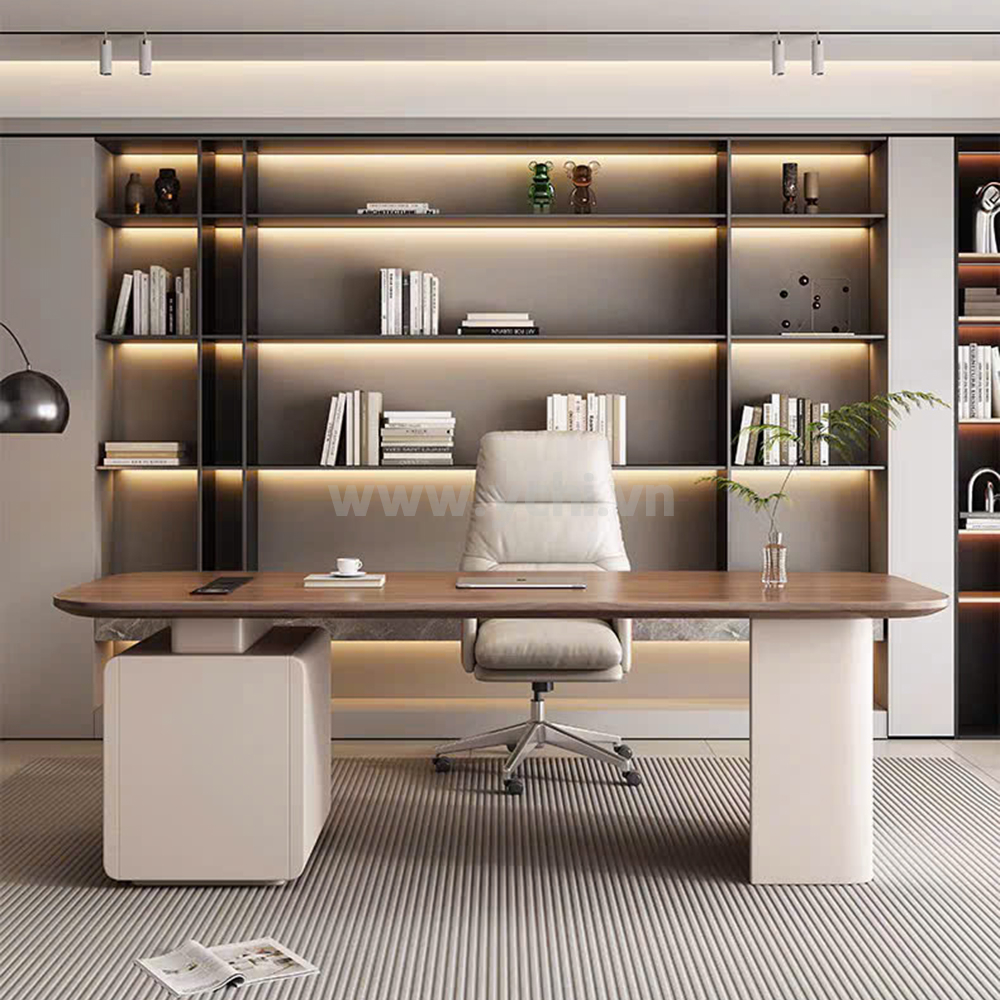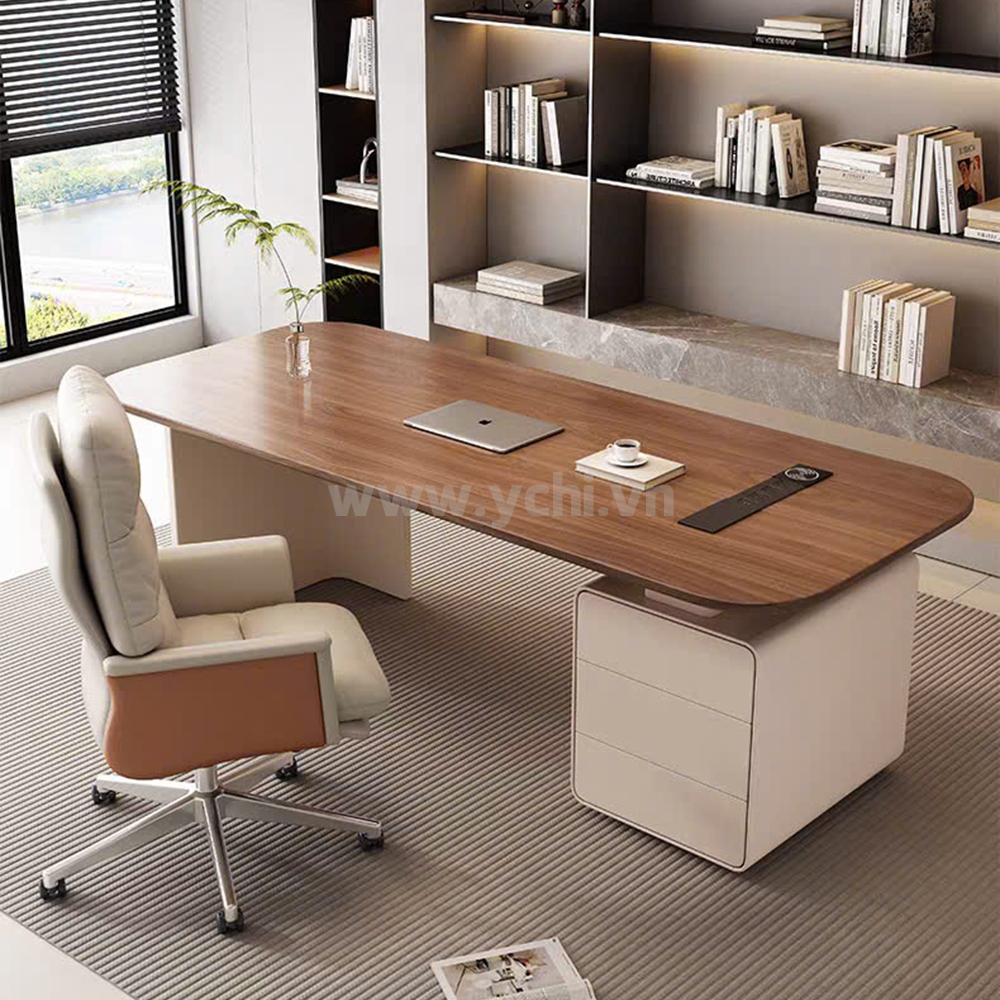 Bàn Lãnh Đạo YCHIMD140 có toàn bộ thân bàn được sản xuất từ gỗ công nghiệp MDF phủ Melamine, nên bàn vừa có kết cấu chắc chắn vừa có tính thẩm mỹ rất cao. Bàn lãnh đạo gỗ này là một siêu phẩm đang rất được ưa chuộng hiện nay tại nội thất YCHI. Bàn được thiết kế thông minh, kiểu dáng thanh lịch phù hợp với cả sếp nam và nữ. Sản phẩm có kiểu dáng hình chữ L, có tủ liền vô cùng tiện lợi. Bàn có kích thước tương đối lớn mang lại không gian làm việc rộng rãi, thoải mái cũng như tạo nên sự quyền lực cho người lãnh đạo.