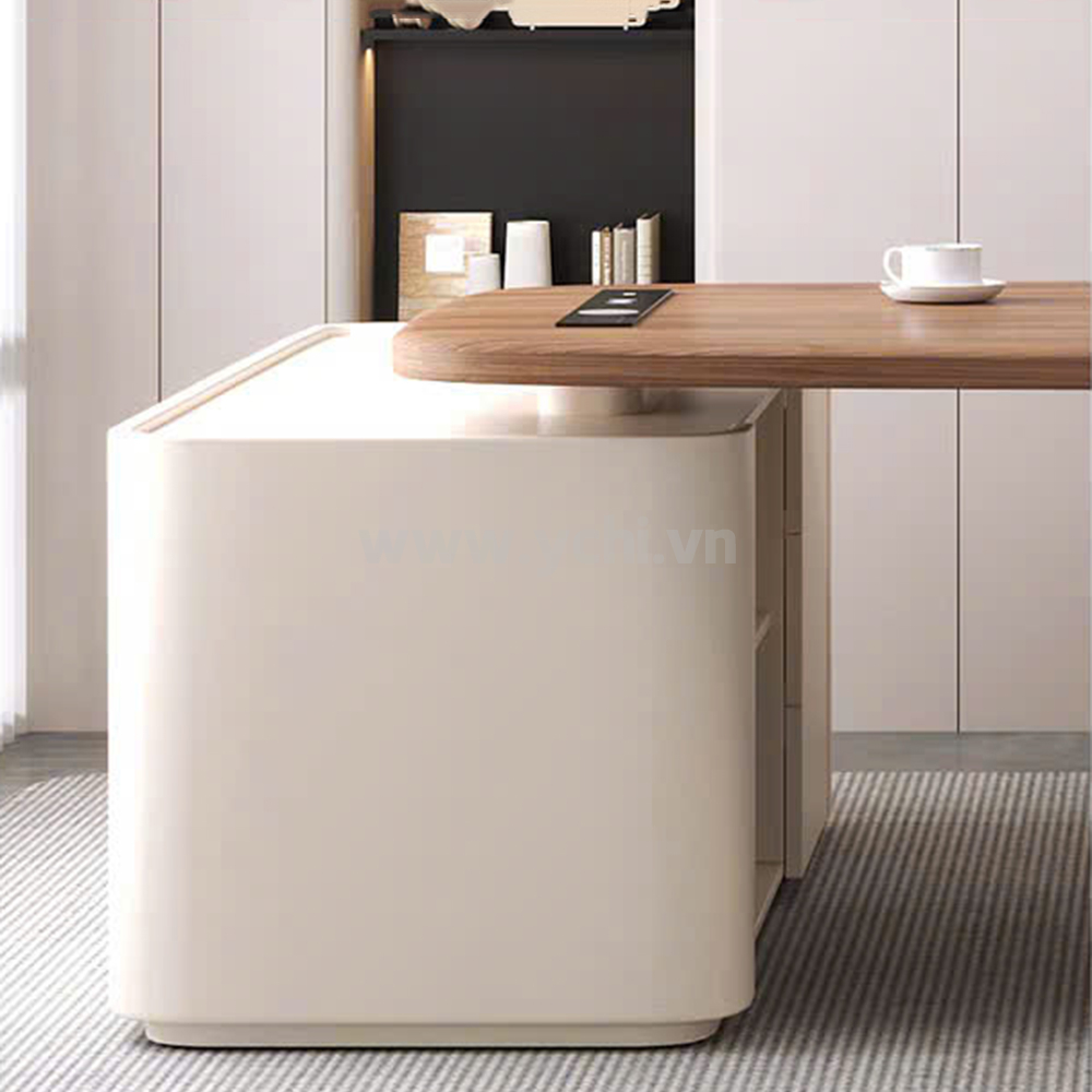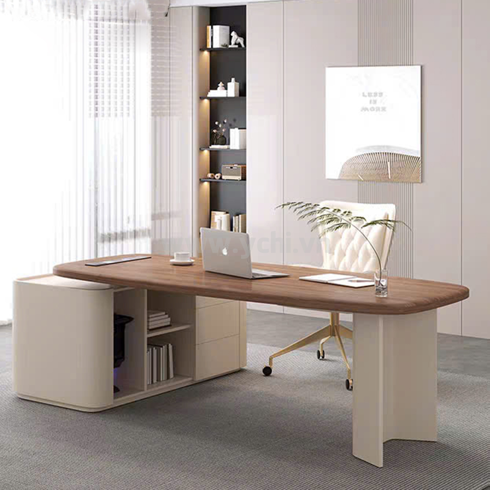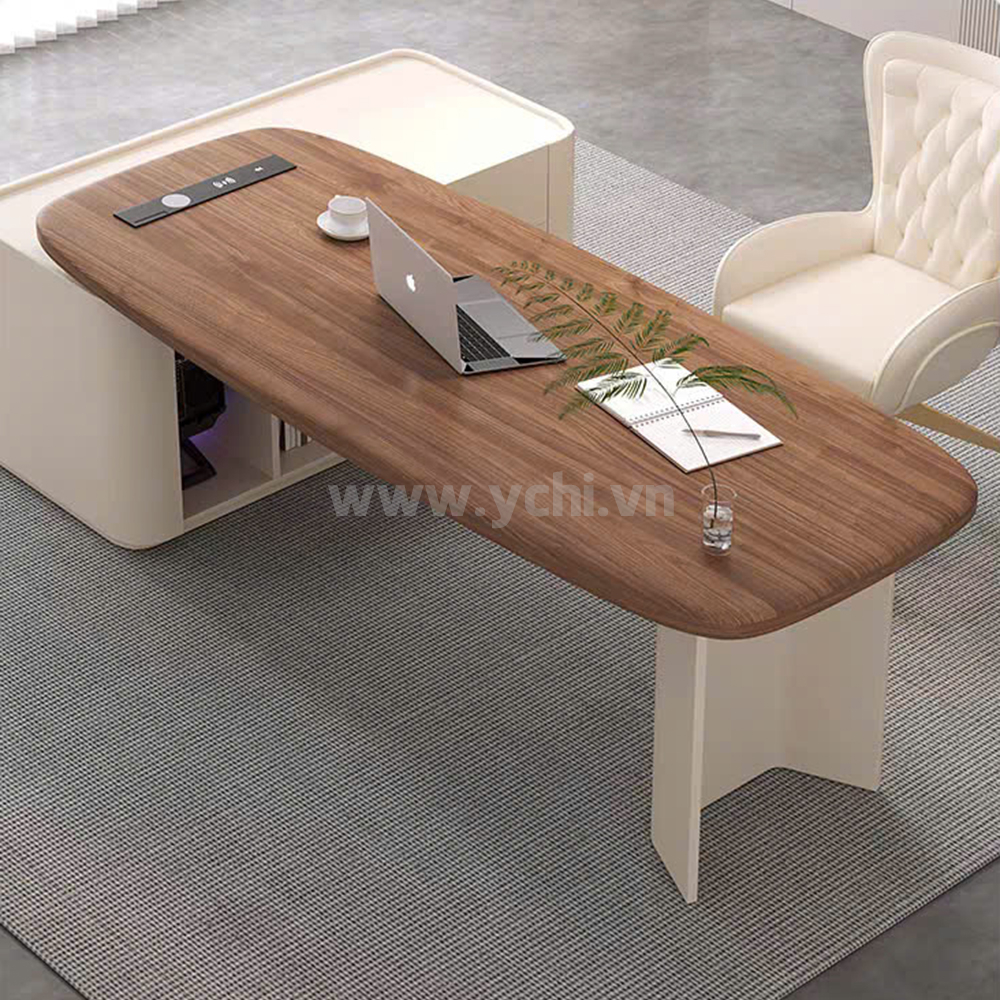 Bàn Lãnh Đạo YCHIMD147 mang lại cảm giác ấm áp và sang trọng như gỗ tự nhiên, chiếc bàn sử dụng gỗ công nghiệp lõi MDF được phủ lớp Veneer vân gỗ cao cấp. Kích thước lớn, mặt bàn rộng rãi, có không gian thoải mái để đặt máy tính, tài liệu và trang trí cá nhân. Điểm nhấn là các chi tiết kim loại (như tay nắm, chân bàn) được mạ Chrome hoặc sơn tĩnh điện, tạo nên sự tương phản nổi bật. Hệ thống hộc tủ và ngăn kéo tích hợp giúp tổ chức tài liệu gọn gàng, thể hiện sự chuyên nghiệp và ngăn nắp của người điều hành.