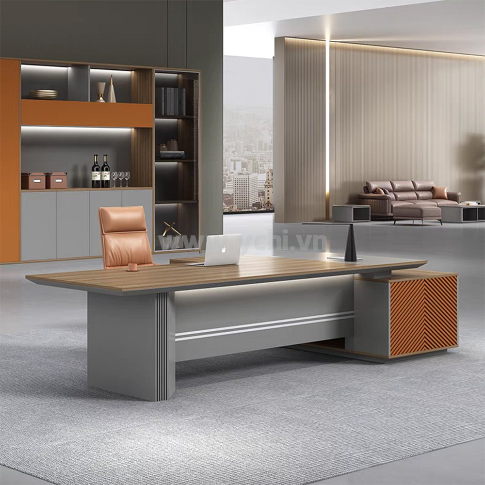 Bàn Quản Lý YCHIMD087 có toàn bộ thân bàn được sản xuất từ gỗ công nghiệp MDF phủ Melamine, nên bàn vừa có kết cấu chắc chắn vừa có tính thẩm mỹ rất cao. Bàn lãnh đạo gỗ này là một siêu phẩm đang rất được ưa chuộng hiện nay tại nội thất YCHI. Bàn được thiết kế thông minh, kiểu dáng thanh lịch phù hợp với cả sếp nam và nữ. Sản phẩm có kiểu dáng hình chữ nhật, có tủ liền vô cùng tiện lợi. Bàn có kích thước tương đối lớn mang lại không gian làm việc rộng rãi, thoải mái cũng như tạo nên sự quyền lực cho người lãnh đạo.