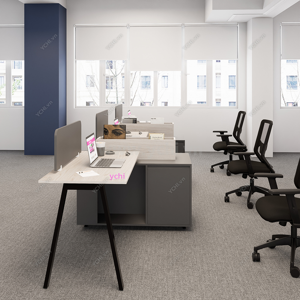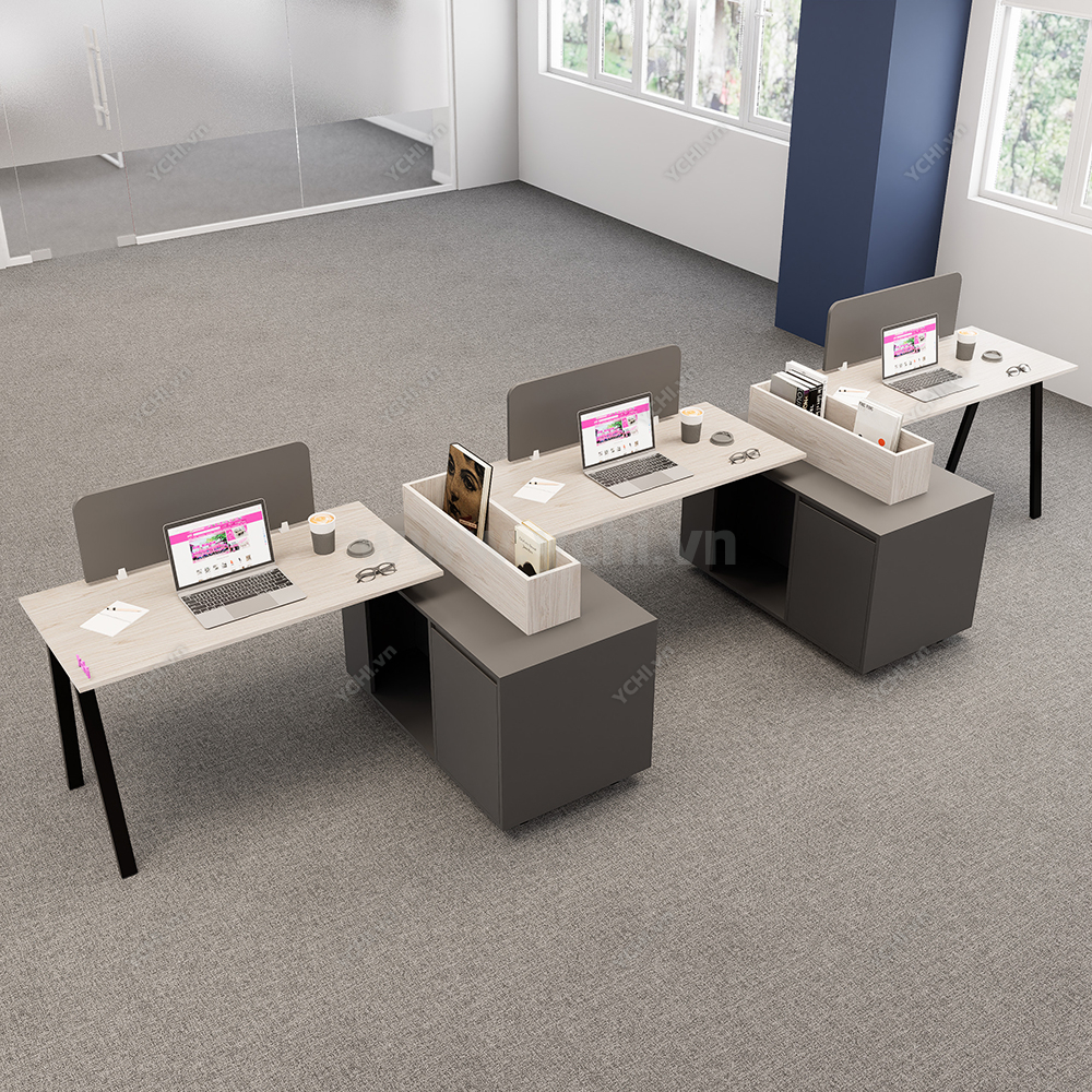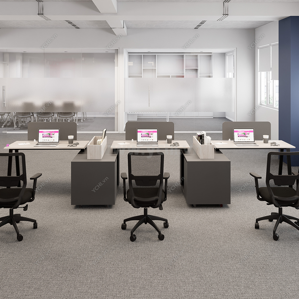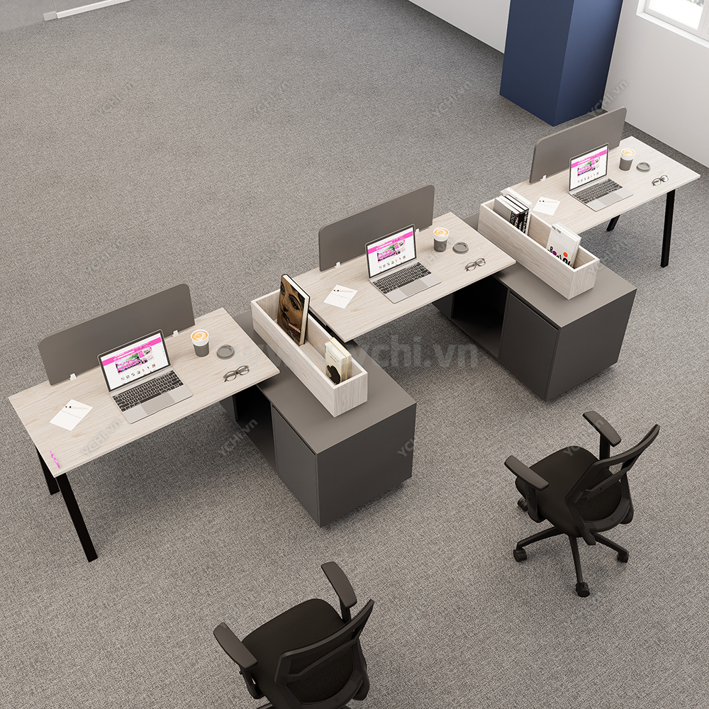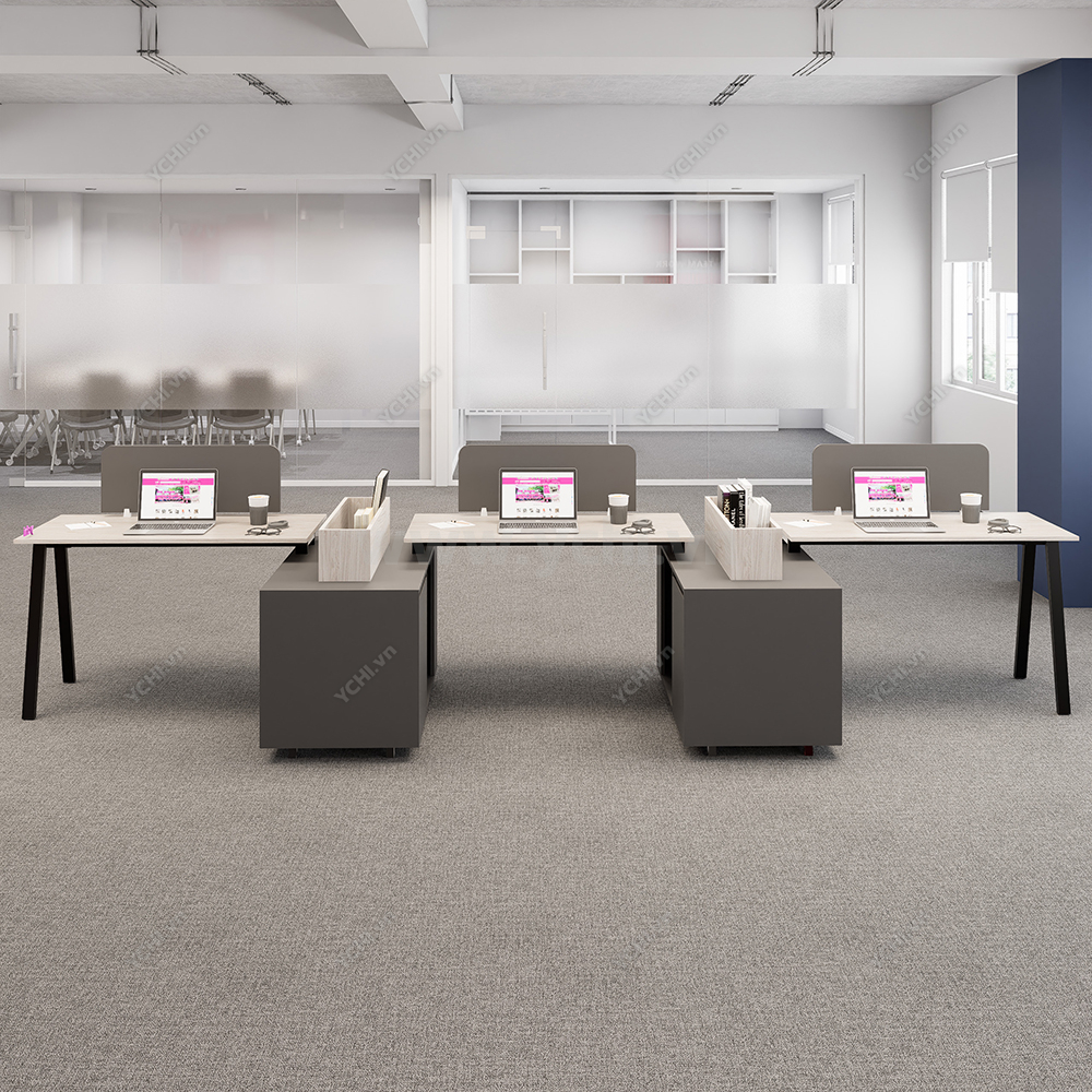 Phá vỡ mọi quy chuẩn truyền thống, Cụm Bàn Làm Việc 3 Người Không Gian Atom Space YCHIAS033 mang đến một diện mạo đầy quyền uy và cá tính cho không gian văn phòng đương đại. Điểm nhấn đột phá của thiết kế này chính là sự phối hợp màu sắc đầy táo bạo giữa mặt bàn gỗ sồi sáng và hệ thống hộc tủ, chân sắt mang tông màu xám ghi đậm, tạo nên chiều sâu và sự vững chãi tuyệt đối. Cấu trúc bàn được dàn hàng ngang nhưng được phân tách thông minh bằng các khối tủ tài liệu đặt vuông góc, tích hợp thêm khay để sách lộ thiên phía trên, giúp việc tiếp cận hồ sơ trở nên nhanh chóng và trực quan hơn bao giờ hết. Vách ngăn lửng màu xám đồng điệu không chỉ đóng vai trò phân định không gian cá nhân mà còn là chi tiết thẩm mỹ hoàn thiện vẻ đẹp hiện đại, chuyên nghiệp. Với kích thước rộng rãi và khả năng chịu lực vượt trội từ hệ chân sắt sơn tĩnh điện chữ A cách điệu, YCHIAS033 không chỉ là nơi làm việc mà còn là tuyên ngôn về phong cách quản trị hiện đại: mạnh mẽ, ngăn nắp và tối ưu hiệu suất.