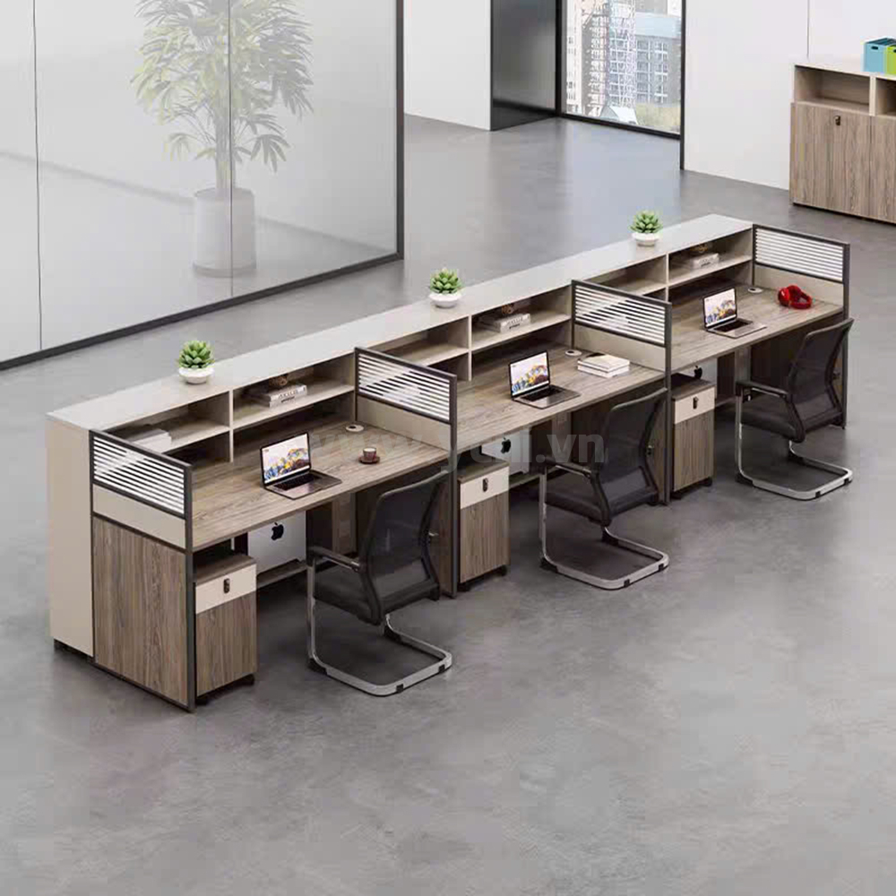 Bàn Làm Việc Cụm 3 Người Không Gian Panel Space YCHIJS033 giúp cho nhân viên có khoảng không gian riêng để tập trung làm việc, từ đó mà năng suất công việc cũng được nâng cao. Lúc cần trao đổi thông tin liên quan đến công việc, những cụm bàn chia ngăn lại trở thành không gian để có thể họp bàn, trao đổi thông tin một cách thuận lợi và nhanh chóng. Chất liệu gỗ MDF phủ Melamine sở hữu nhiều ưu việt như chống trầy, chống nước, bền màu cho không gian làm việc chuyên nghiệp, kết hợp hệ khung vách ngăn nhôm định hình 50, sơn tĩnh điện, đảm bảo độ bền cao, tạo nên một kết cấu vững chắc, an tâm sử dụng.