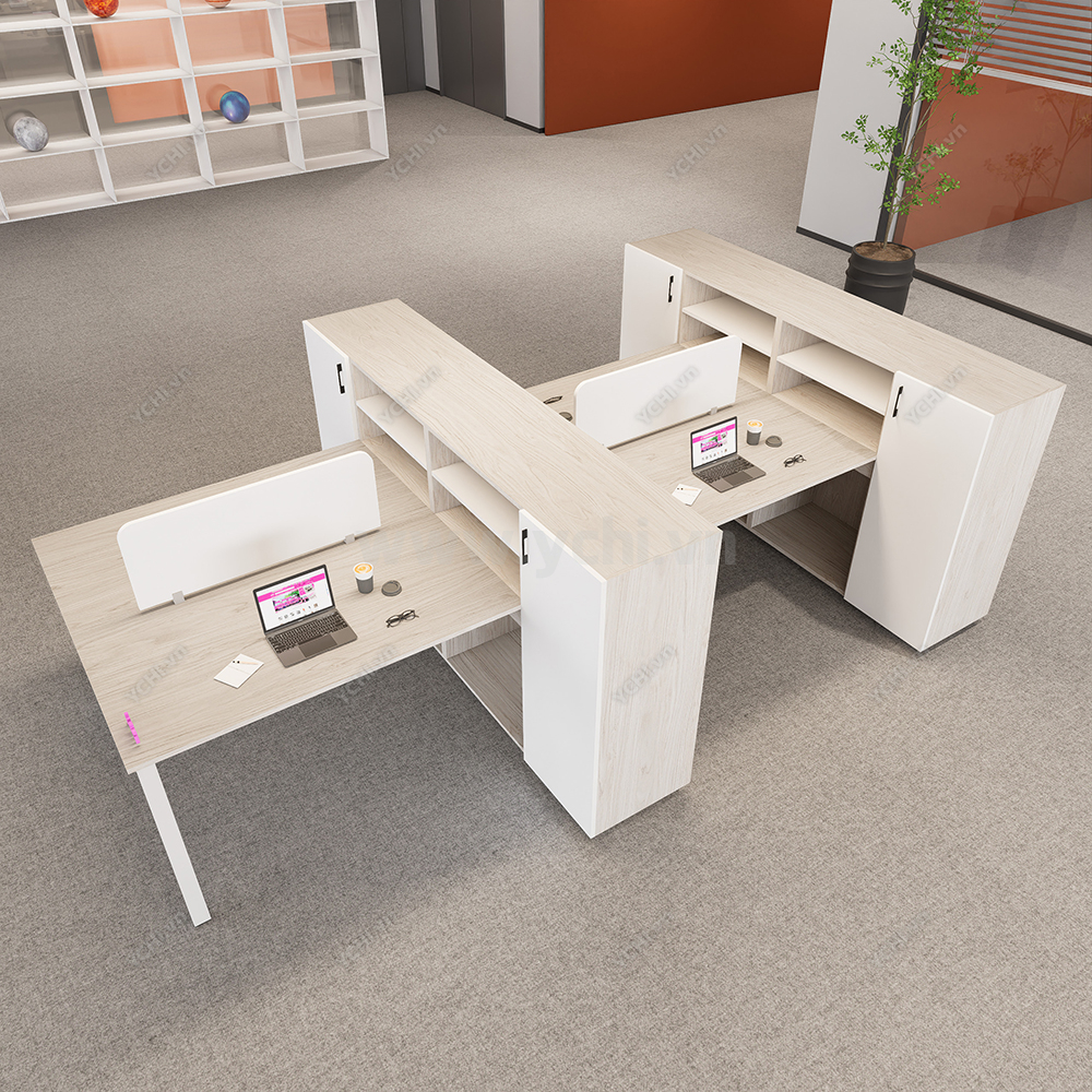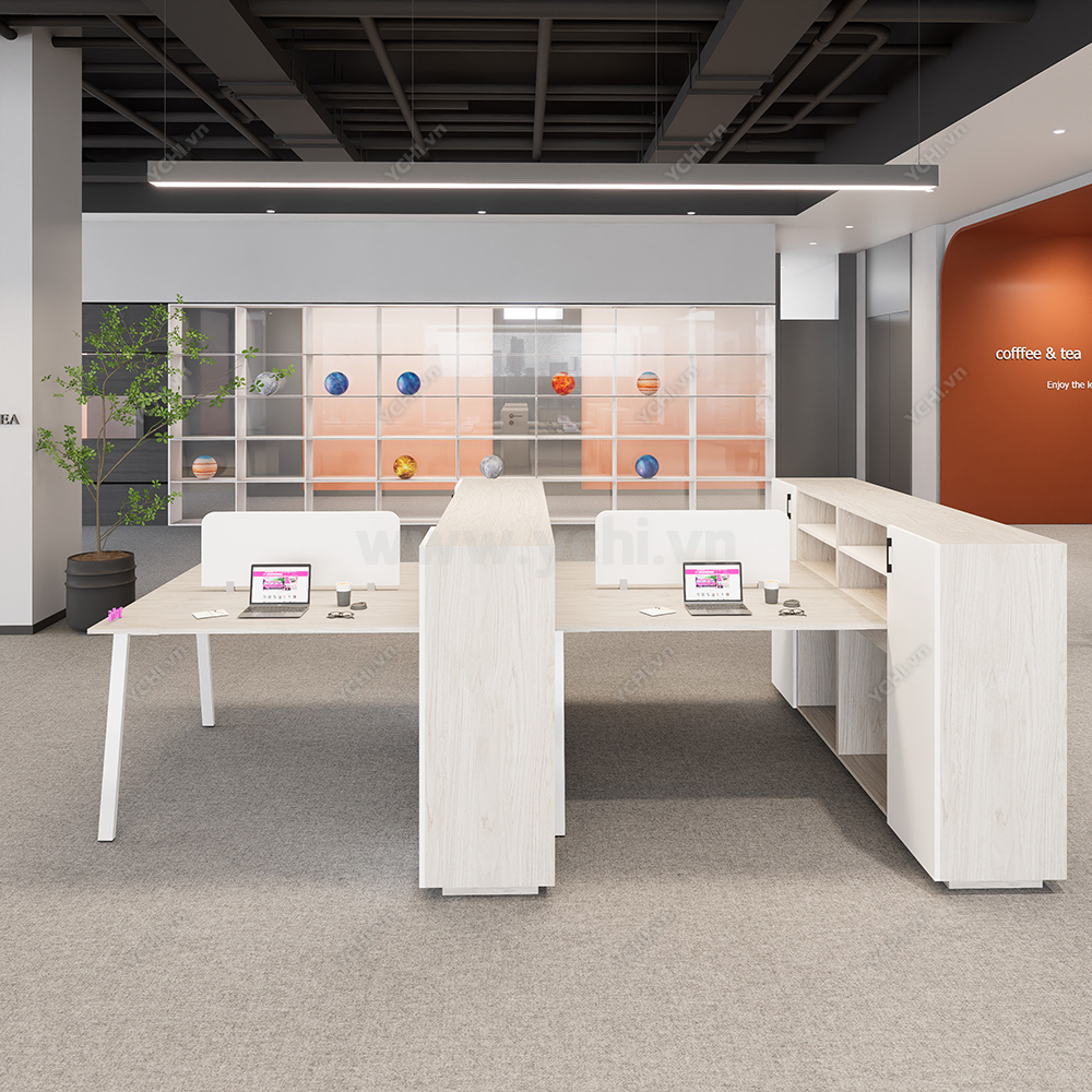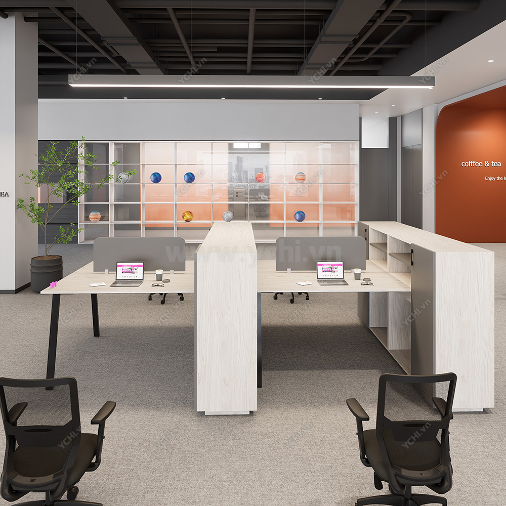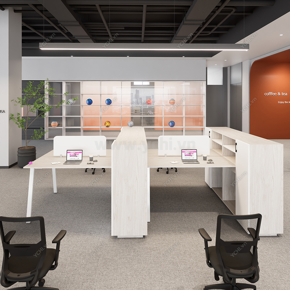 Cụm Bàn Làm Việc 4 Người Không Gian Atom Space YCHIAS046 mang phong cách hiện đại, thiết kế cổ điển, vuông vức, làm cho không gian văn phòng trở nên sang trọng, lịch lãm, đẳng cấp. Đặc biệt, thiết kế mang đến sự hoàn hảo trong không gian sử dụng, có thể kết hợp với tủ di động để tối ưu không gian lưu trữ.