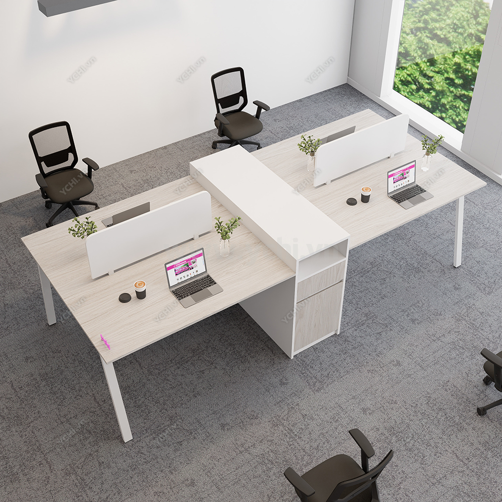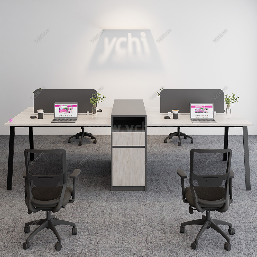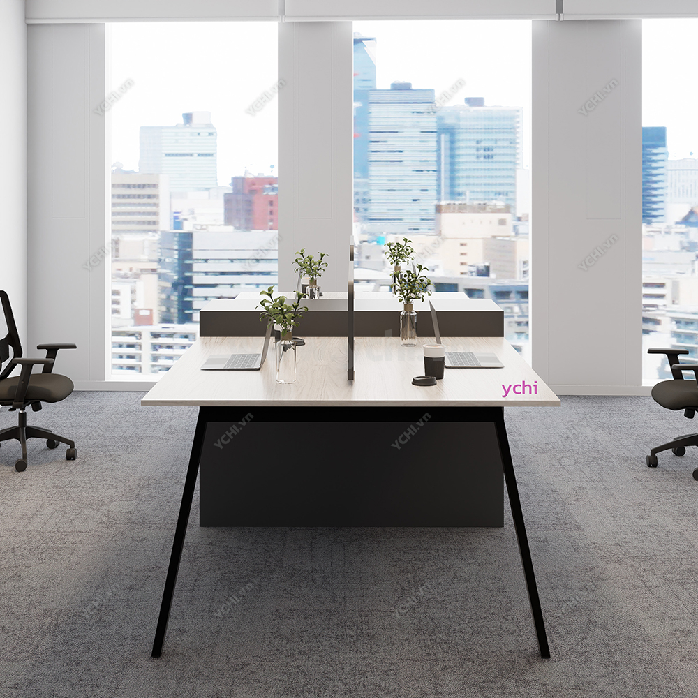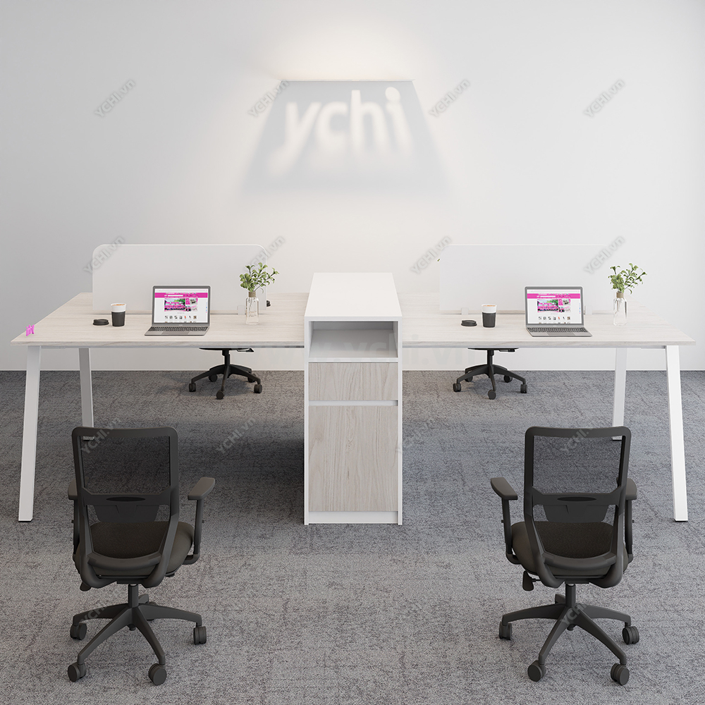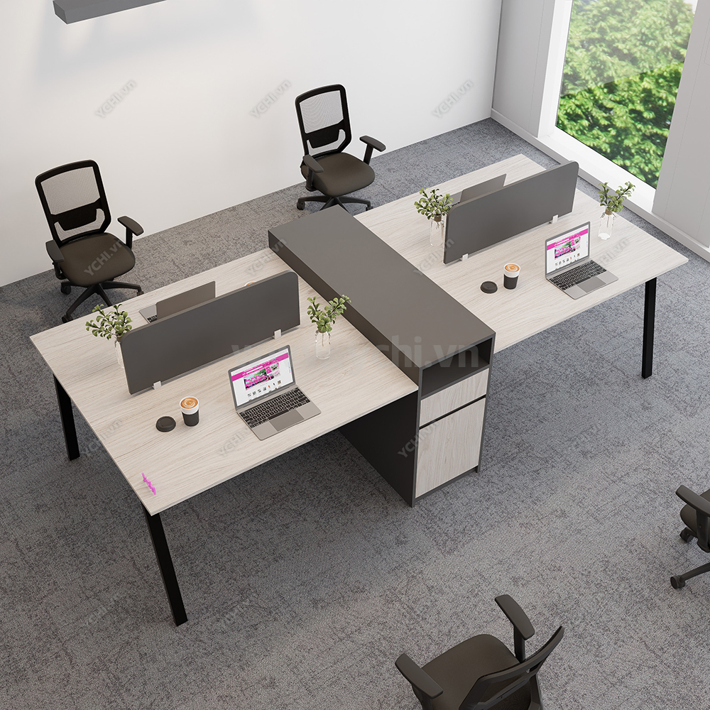 Được khơi nguồn từ ý tưởng về một văn phòng xanh và hiện đại, Cụm Bàn Làm Việc 4 Người Không Gian Atom Space YCHIAS048 kiến tạo nên một không gian làm việc đầy tính tương tác và thẩm mỹ. Điểm nhấn thị giác thu hút nhất nằm ở hệ thống hộc tủ trung tâm được biến tấu thông minh, tích hợp các khoang kệ mở phía trên giúp đội ngũ dễ dàng trang trí cây xanh hay đặt những cuốn sách truyền cảm hứng ngay trong tầm mắt. Sự phối hợp giữa mặt bàn gỗ công nghiệp tông sáng vân tự nhiên cùng vách ngăn lửng màu trắng tạo nên một chỉnh thể tinh khôi, giúp giải tỏa áp lực thị giác và mở rộng không gian đáng kể. Cấu trúc chân sắt chữ A sơn tĩnh điện đen vững chãi không chỉ mang lại độ bền cơ học cao mà còn tạo nên nét đối lập màu sắc đầy tinh tế. YCHIAS048 không chỉ đáp ứng hoàn hảo nhu cầu lưu trữ tài liệu khoa học nhờ hệ ngăn kéo có khóa an toàn, mà còn là giải pháp nội thất chiến lược giúp duy trì sự ngăn nắp, thúc đẩy tinh thần làm việc nhóm và xây dựng hình ảnh thương hiệu năng động, sáng tạo cho mọi doanh nghiệp dẫn đầu.