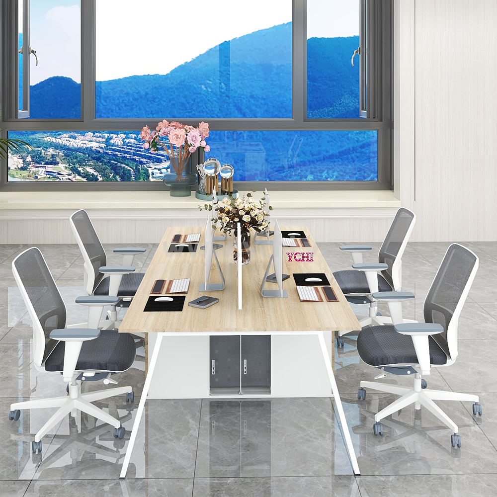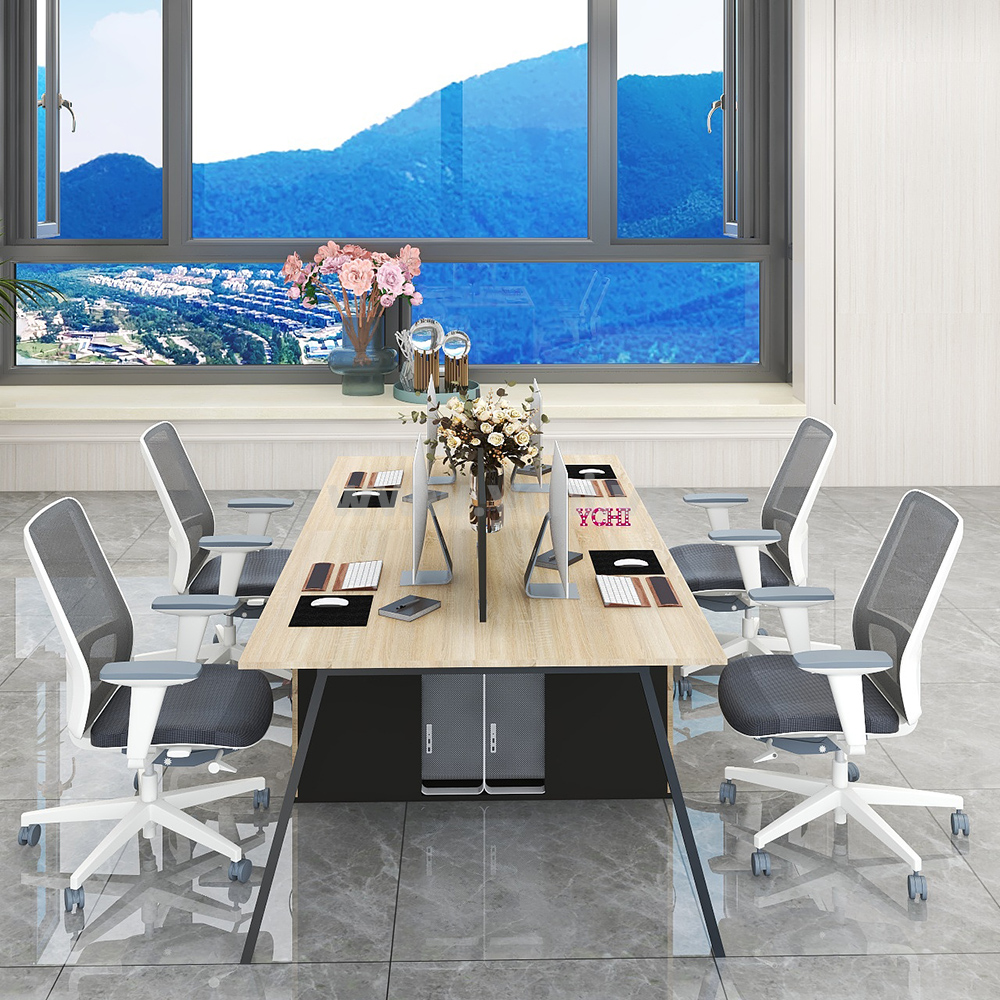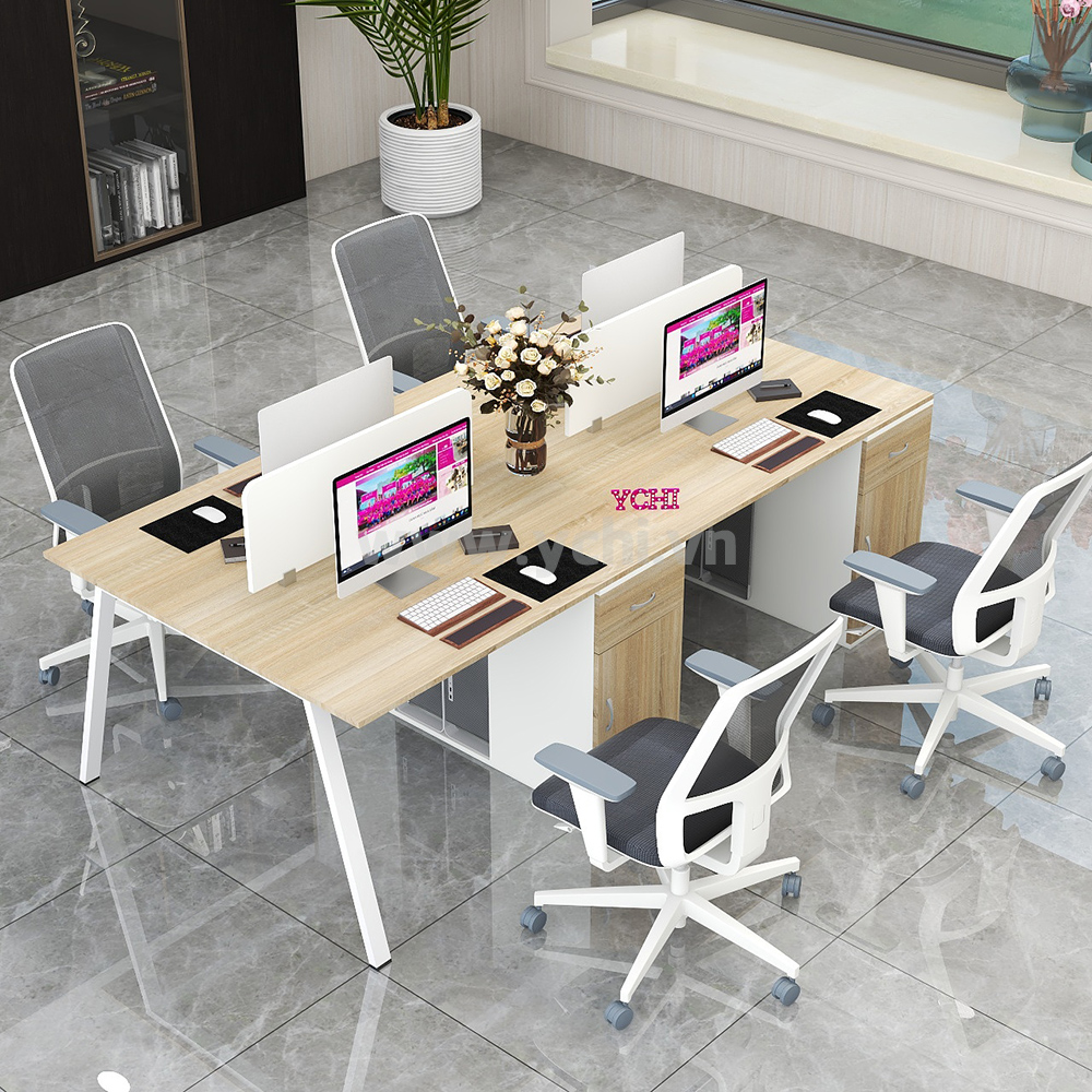 Cụm Bàn Làm Việc 4 Người Không Gian Atom Space YCHIAS007 có mặt bàn và chân tủ được làm từ gỗ MDF phủ Melamine cho bề mặt sản phẩm rất đẹp mắt, chống nước. Kết hợp hệ khung chân thép sơn tĩnh điện chống ăn mòn hoá học, đảm bảo độ bền cao.
