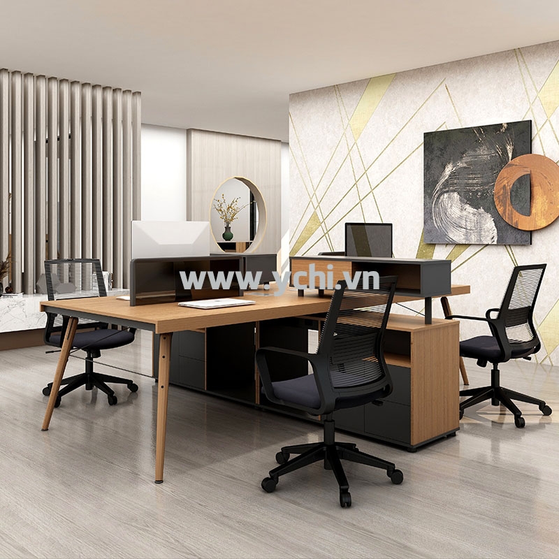 Cụm Bàn Làm Việc 4 Người Không Gian Time Space YCHIDS009 mang phong cách hiện đại, thiết kế đơn giản tập trung khai thác công năng nhưng vẫn không kém phần sang trọng. Cấu tạo bàn làm việc chắc chắn, chất lượng vượt trội. Điểm đặc biệt của không gian Time Space là phần chân bàn bằng gỗ được nối với mặt bàn bằng khớp gắn sắt sơn tĩnh điện cực kì chắc chắn, nhưng lại dễ dàng tháo lắp, vận chuyển.