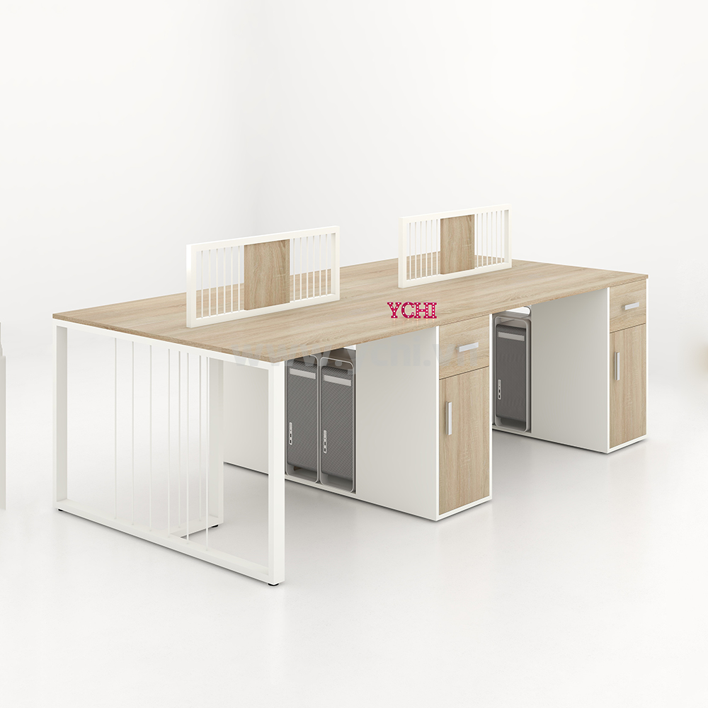 Cụm Bàn Làm Việc 4 Người Không Gian Eke Space YCHIES002 với mặt bàn và chân tủ được làm từ gỗ MDF phủ Melamine cho bề mặt sản phẩm rất đẹp mắt, chống nước. Kết hợp hệ khung chân thép sơn tĩnh điện chống ăn mòn hoá học, đảm bảo độ bền cao.