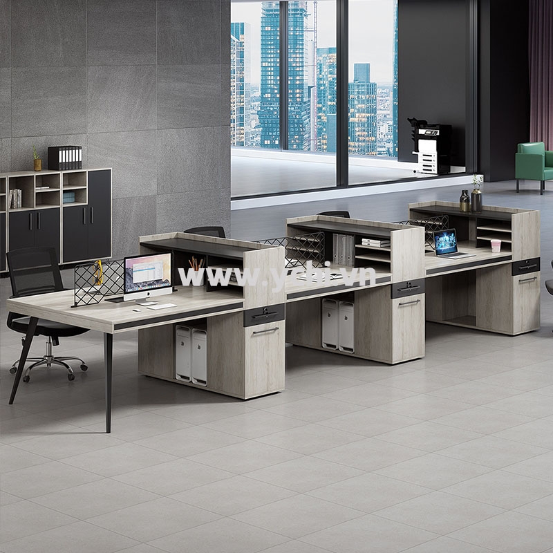 Bàn Làm Việc Cụm 6 Người Không Gian Cone Space YCHICS022 với chân thép sơn tĩnh điện, lắp ráp ngàm chắc chắn, kết hợp với mặt bàn được làm từ gỗ tiêu chuẩn. Bàn có thiết kế hiện đại với kích thước tiêu chuẩn phù hợp với mọi loại ghế văn phòng, phù hợp với nhiều không gian văn phòng. Bàn có tủ liền với mặt bàn, giúp dễ dàng lưu trữ vật dụng của mỗi nhân viên. Thêm vào đó là mặt bàn dày 10cm, cho một kết cấu chắc chắn, sang trọng.