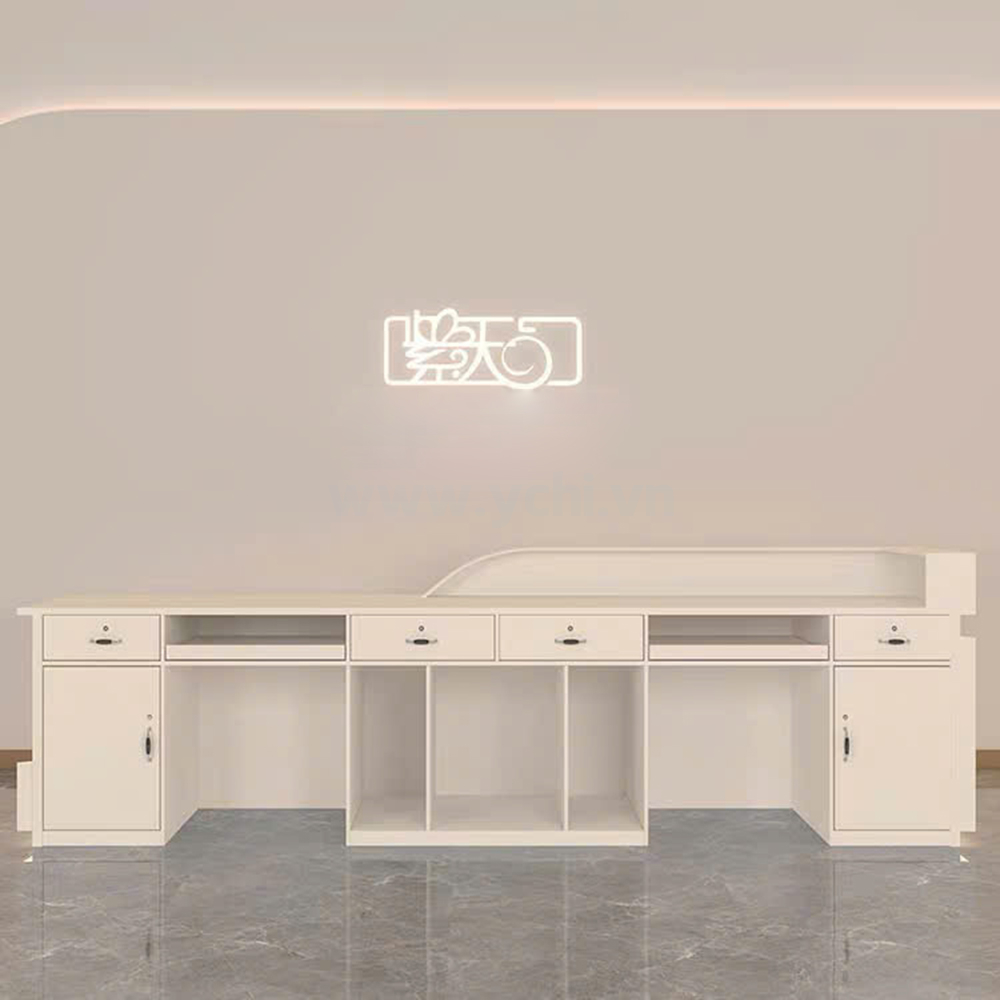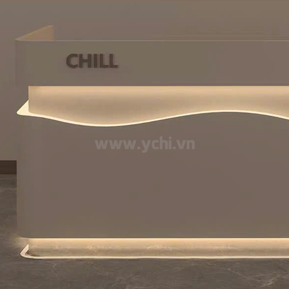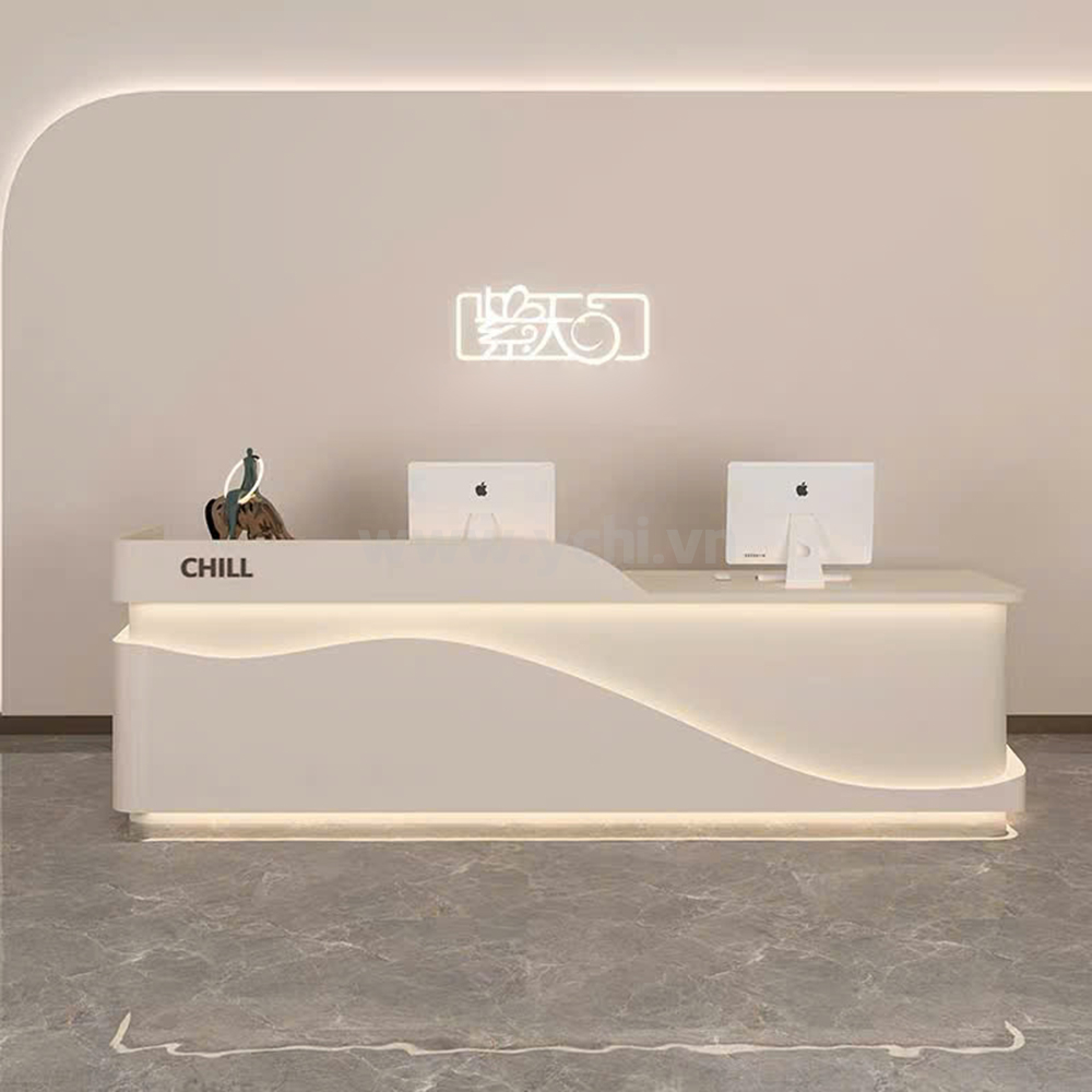 Điểm nhấn mang hơi thở vị lai chính là hệ thống đèn LED âm nghệ thuật được tích hợp khéo léo, hắt sáng qua các khe vách tinh tế, giúp chiếc quầy bừng sáng và thu hút mọi ánh nhìn. Sự phối hợp giữa tông màu trắng thanh lịch và các điểm nhấn như lam gỗ hay viền vàng Gold giúp sản phẩm dễ dàng hòa nhập vào không gian của các văn phòng, Clinic hay Spa cao cấp. Không chỉ tối ưu về công năng làm việc, mẫu quầy này còn là "điểm chạm" thương hiệu đắt giá, khẳng định phong cách chuyên nghiệp và tầm nhìn vượt thời đại của doanh nghiệp.