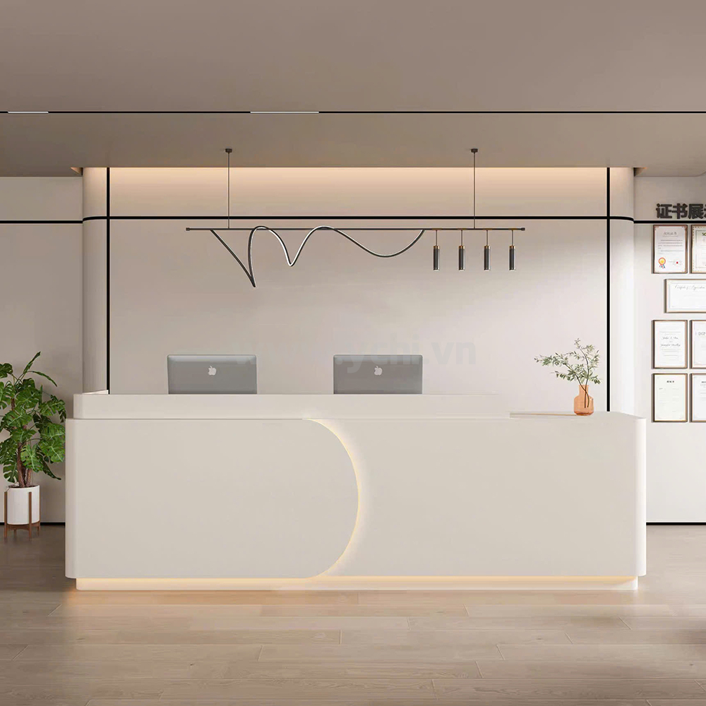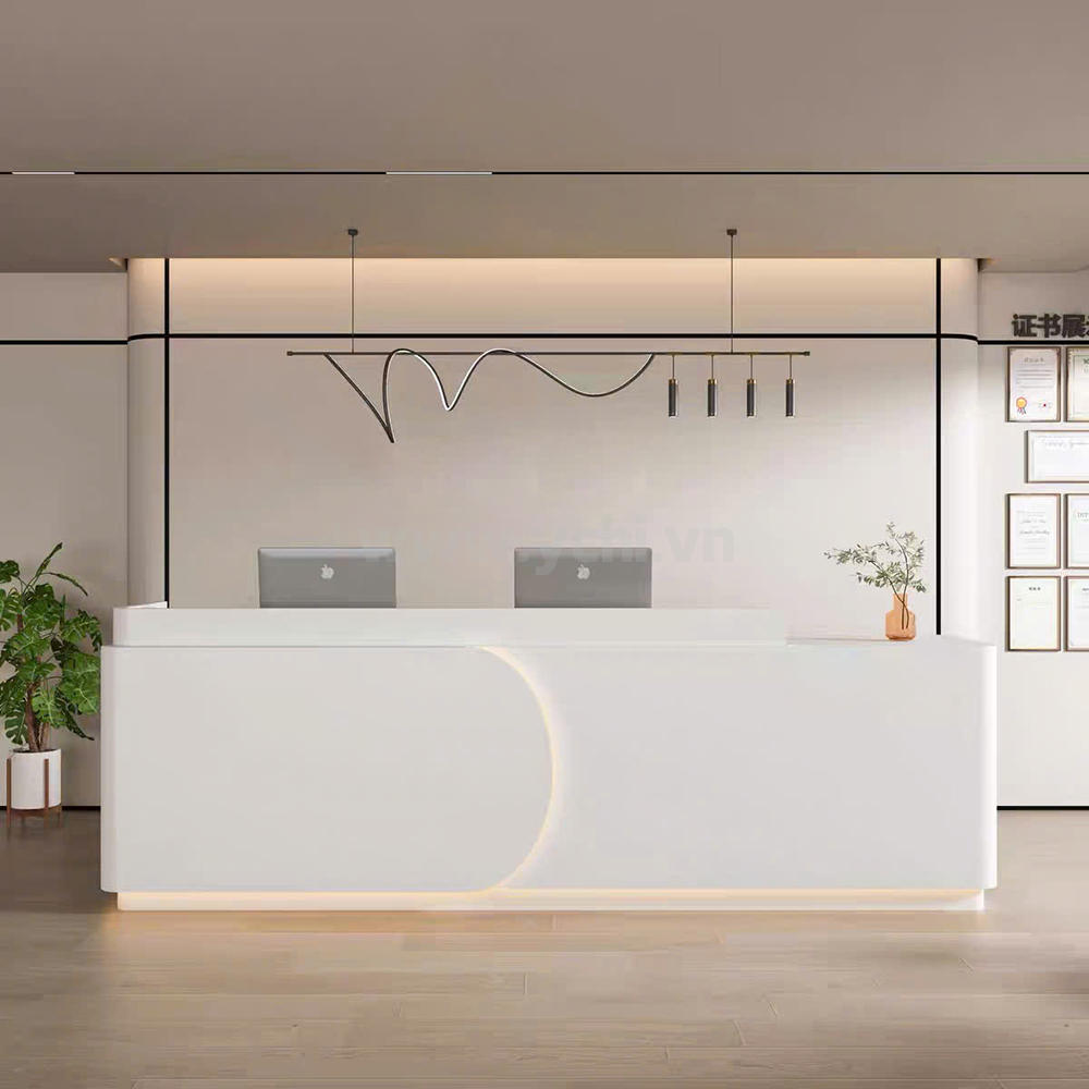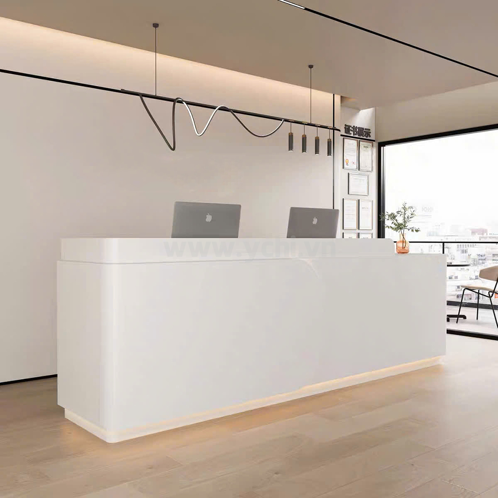 Sự tinh tế của sản phẩm còn được thể hiện qua những đường cắt CNC sắc sảo, từ khối hình học dứt khoát đến các đường bo cong nghệ thuật uốn lượn mềm mại. Hệ thống đèn LED hắt sáng được tính toán vị trí khéo léo, tạo nên các hiệu ứng hào quang tinh xảo, giúp không gian sảnh bừng sáng vẻ đẹp vị lai và chuyên nghiệp. Với sự phối hợp màu sắc hài hòa giữa tông trắng sứ, kem thanh lịch và những điểm nhấn vàng đồng quý phái, mẫu quầy này chính là mảnh ghép chiến lược để các văn phòng, Spa và Clinic cao cấp khẳng định vị thế dẫn đầu trong mắt khách hàng.