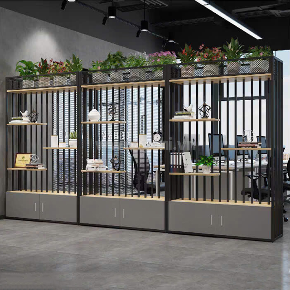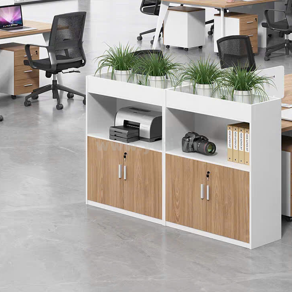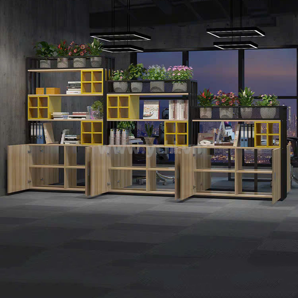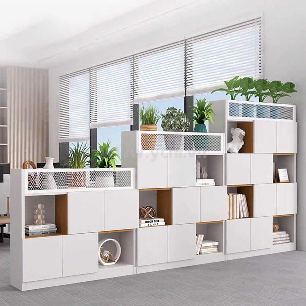 - Tủ-kệ chậu cây kết hợp tủ tài liệu: Phần dưới có cánh cửa mở hoặc cửa lùa, có khóa để lưu trữ tài liệu quan trọng.