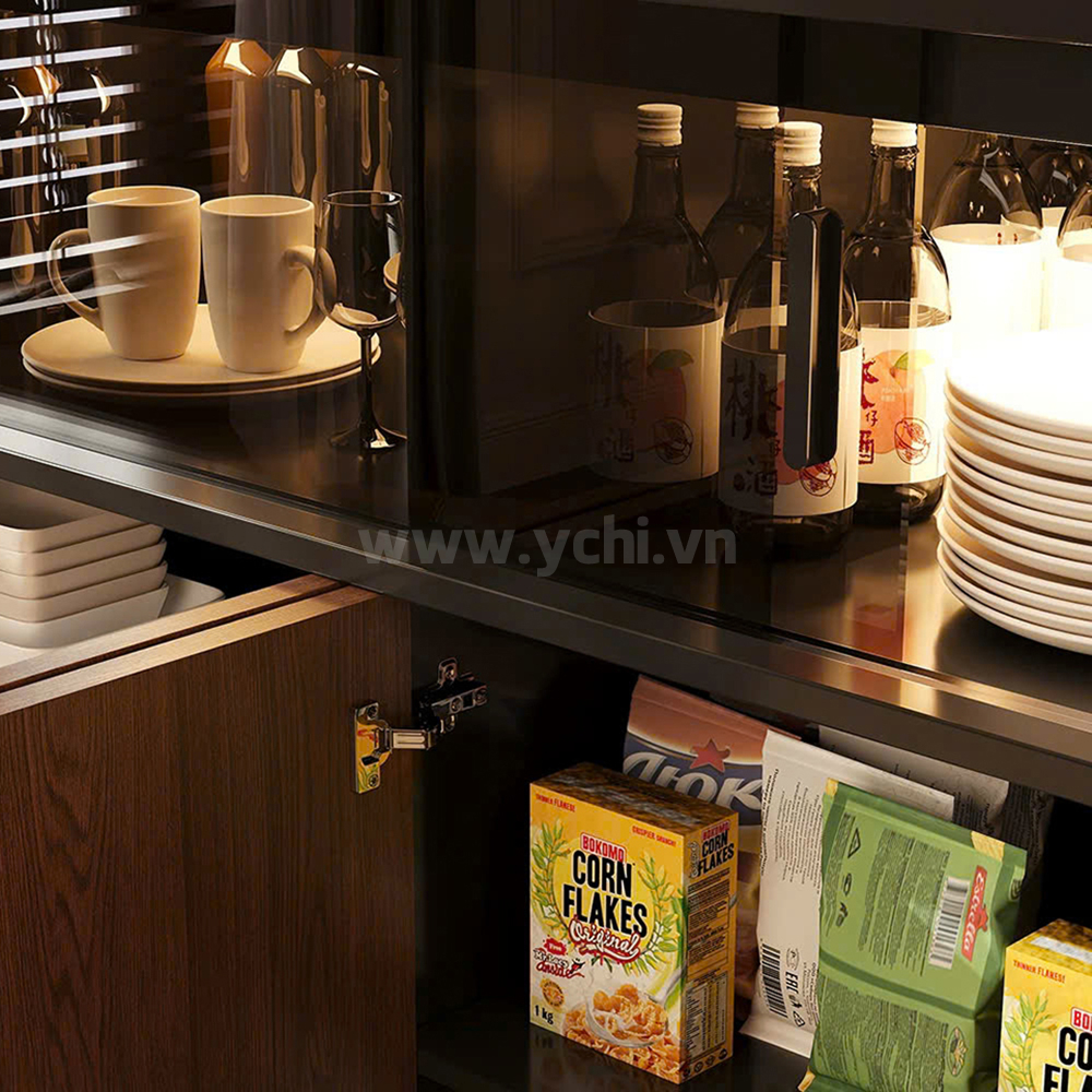Tủ Phòng Ăn YCHITA006 là sự kết hợp hoàn hảo giữa thiết kế hiện đại, sang trọng và công năng sử dụng tối ưu, làm nổi bật không gian sống đẳng cấp. Sản phẩm được chế tác từ chất liệu gỗ công nghiệp MDF phủ Melamine cao cấp hoặc Plywood phủ Veneer, kết hợp với công nghệ sơn PU giúp bảo vệ bề mặt, chống trầy xước và tăng tính thẩm mỹ. Sản phẩm nổi bật với thiết kế cánh tủ được trang trí bởi các đường nét đẹp mắt, tạo điểm nhấn nghệ thuật và sự tinh tế cho không gian phòng ăn. Tủ được thiết kế gồm nhiều khoang lưu trữ linh hoạt: các ngăn mở dùng để trưng bày ly tách, chai rượu vang và phụ kiện; phần tủ rượu với các kệ nhỏ chuyên dụng giúp sắp xếp rượu ngăn ngập và tiện lợi. Có thể có các hệ thống đèn LED chiếu sáng bên trong tủ không chỉ làm nổi bật sản phẩm trưng bày mà còn tạo không gian ấm cúng, sang trọng. Chất liệu gỗ MDF/Plywood đảm bảo độ bền cao, chống ẩm mốc và mối mọt. Lớp phủ Melamine/Veneer cùng sơn PU giúp tủ giữ được vẻ đẹp bóng đẹp theo thời gian. Mẫu tủ này không chỉ là một sản phẩm nội thất hữu dụng mà còn là một tác phẩm nghệ thuật, mang đến sự sang trọng và đẳng cấp cho ngôi nhà của bạn.