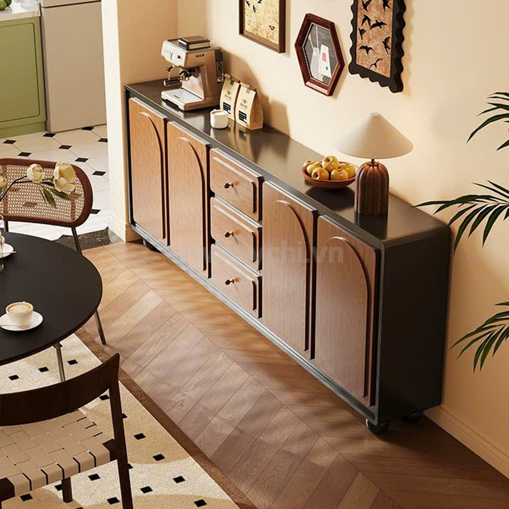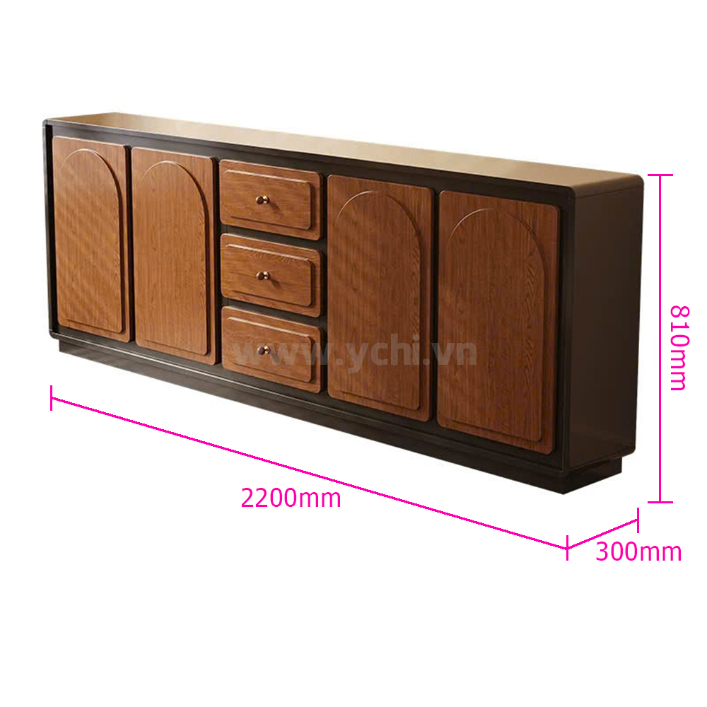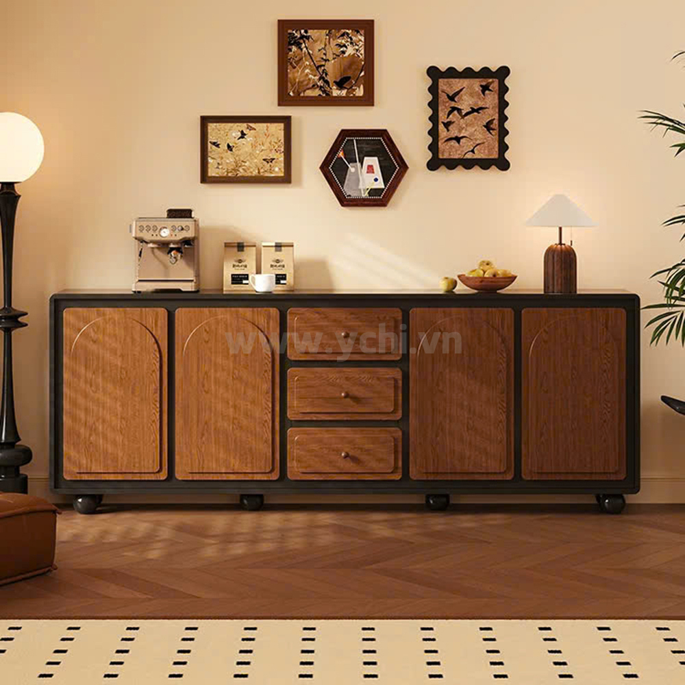 Tủ Phòng Ăn YCHITA010 là sự kết hợp hoàn hảo giữa thiết kế hiện đại, sang trọng và công năng sử dụng tối ưu, làm nổi bật không gian sống đẳng cấp. Sản phẩm được chế tác từ chất liệu gỗ công nghiệp MDF phủ Melamine cao cấp hoặc Plywood phủ Veneer, kết hợp với công nghệ sơn PU giúp bảo vệ bề mặt, chống trầy xước và tăng tính thẩm mỹ. Sản phẩm nổi bật với thiết kế cánh tủ được trang trí bởi các đường nét đẹp mắt, tạo điểm nhấn nghệ thuật và sự tinh tế cho không gian phòng ăn. Tủ được thiết kế gồm nhiều khoang lưu trữ linh hoạt: các ngăn mở dùng để trưng bày ly tách, chai rượu vang và phụ kiện; phần tủ rượu với các kệ nhỏ chuyên dụng giúp sắp xếp rượu ngăn ngập và tiện lợi. Có thể có các hệ thống đèn LED chiếu sáng bên trong tủ không chỉ làm nổi bật sản phẩm trưng bày mà còn tạo không gian ấm cúng, sang trọng. Chất liệu gỗ MDF/Plywood đảm bảo độ bền cao, chống ẩm mốc và mối mọt. Lớp phủ Melamine/Veneer cùng sơn PU giúp tủ giữ được vẻ đẹp bóng đẹp theo thời gian. Mẫu tủ này không chỉ là một sản phẩm nội thất hữu dụng mà còn là một tác phẩm nghệ thuật, mang đến sự sang trọng và đẳng cấp cho ngôi nhà của bạn.