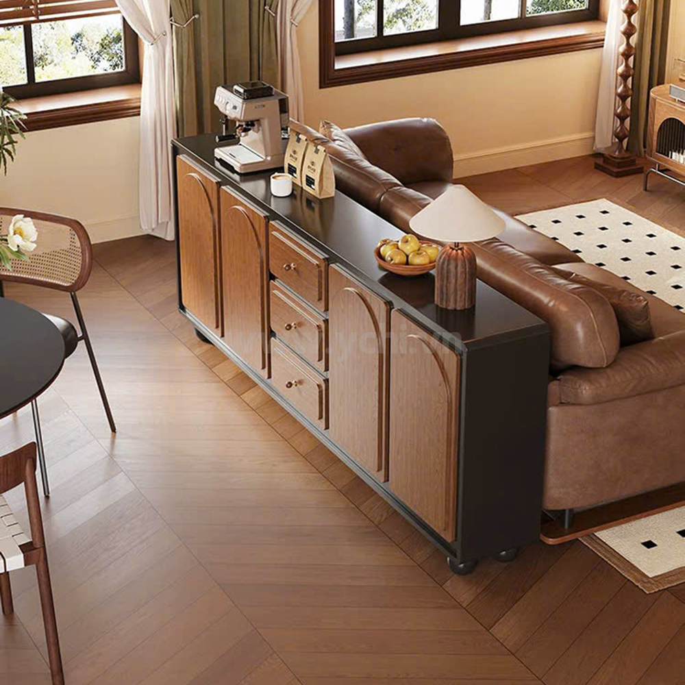 Nâng tầm trải nghiệm ẩm thực với mẫu Tủ Phòng Ăn Vân Gỗ Tự Nhiên YCHITA010 mang phong cách khối hiện đại, một giải pháp lưu trữ đa năng đầy lôi cuốn. Sản phẩm được sản xuất từ chất liệu gỗ MDF phủ Melamine hoặc Plywood phủ Veneer chống ẩm vượt trội, kết hợp bề mặt sơn PU cao cấp giúp duy trì độ sáng bóng và bảo vệ cốt gỗ bền bỉ theo thời gian. Thiết kế gây ấn tượng với sự phân chia không gian thông minh: các khoang trưng bày mở được tích hợp hệ thống đèn LED dải hiện đại, làm nổi bật những chai rượu vang và bộ sưu tập ly tách quý giá. Khu vực trung tâm phẳng mịn là nơi lý tưởng để bố trí máy pha cà phê, tạo nên một "mini bar" sang trọng ngay tại gia. Hệ ngăn kéo mượt mà cùng các hộc tủ đóng kín phía dưới giúp gia chủ lưu trữ đồ dùng bếp một cách khoa học, đảm bảo không gian luôn gọn gàng, tinh tế. Sự giao thoa giữa tông màu gỗ ấm áp và đường nét kiến trúc mạnh mẽ biến chiếc tủ không chỉ là vật dụng nội thất mà còn là món đồ trang trí đẳng cấp, khẳng định vị thế của chủ nhân.