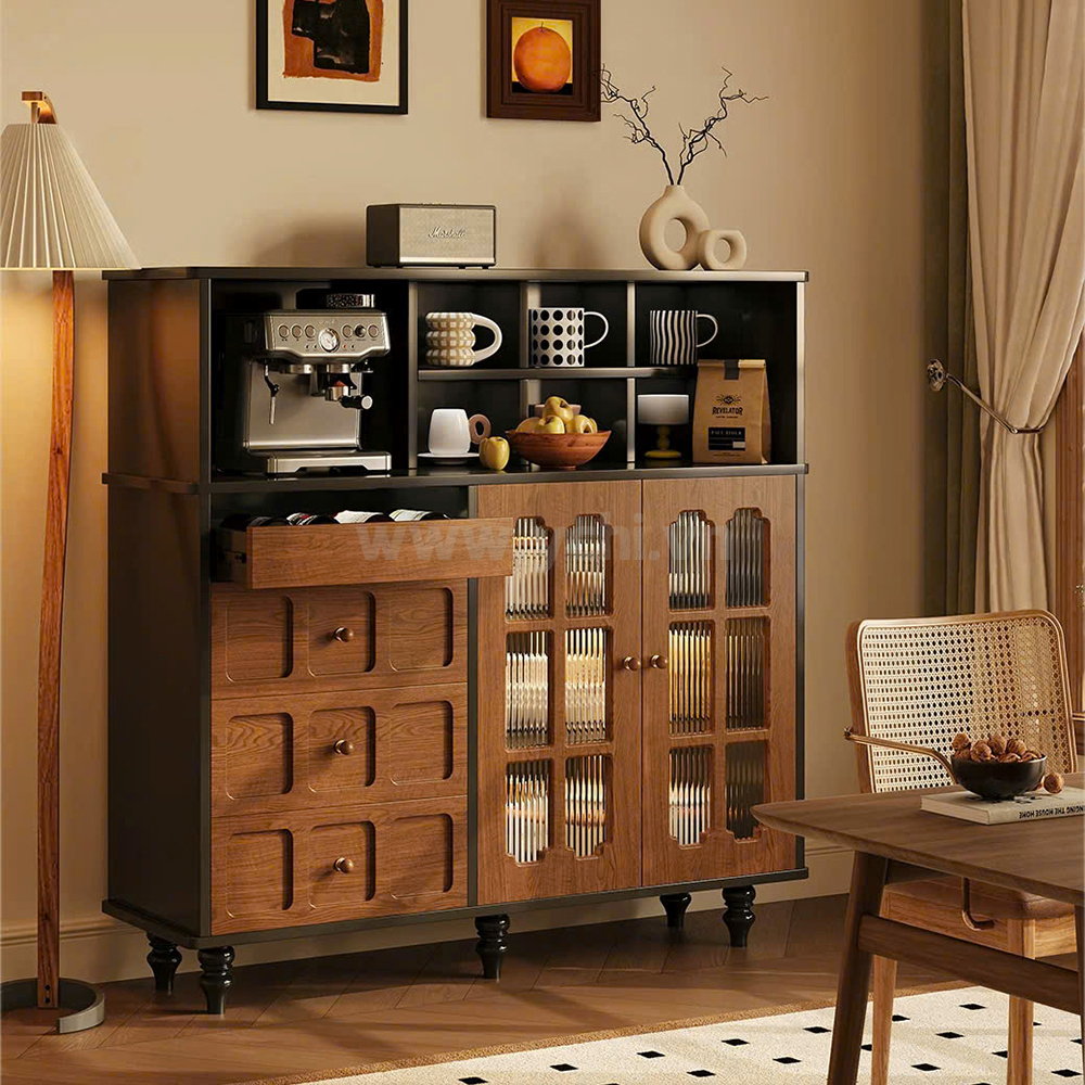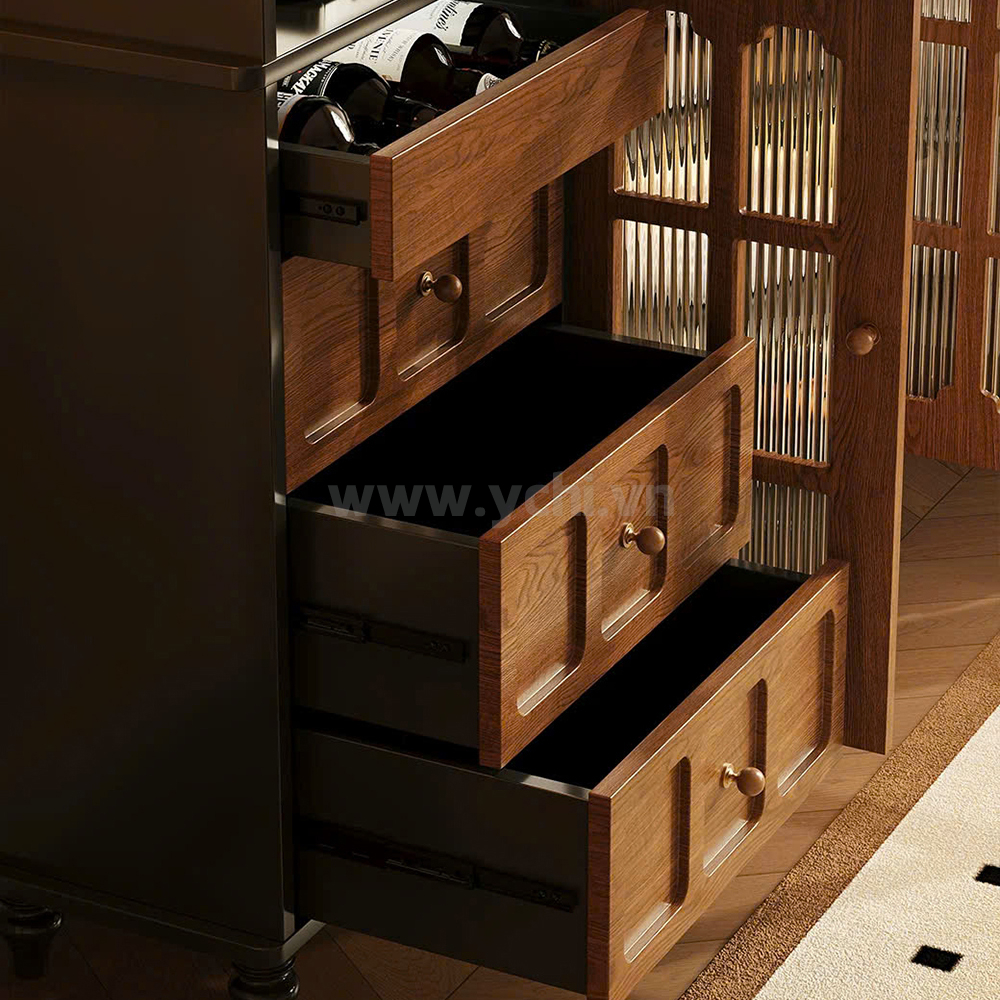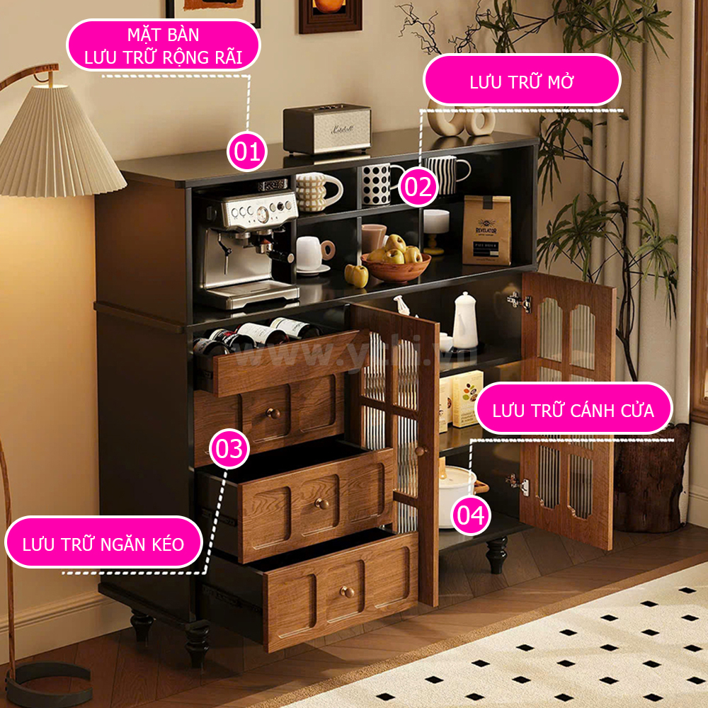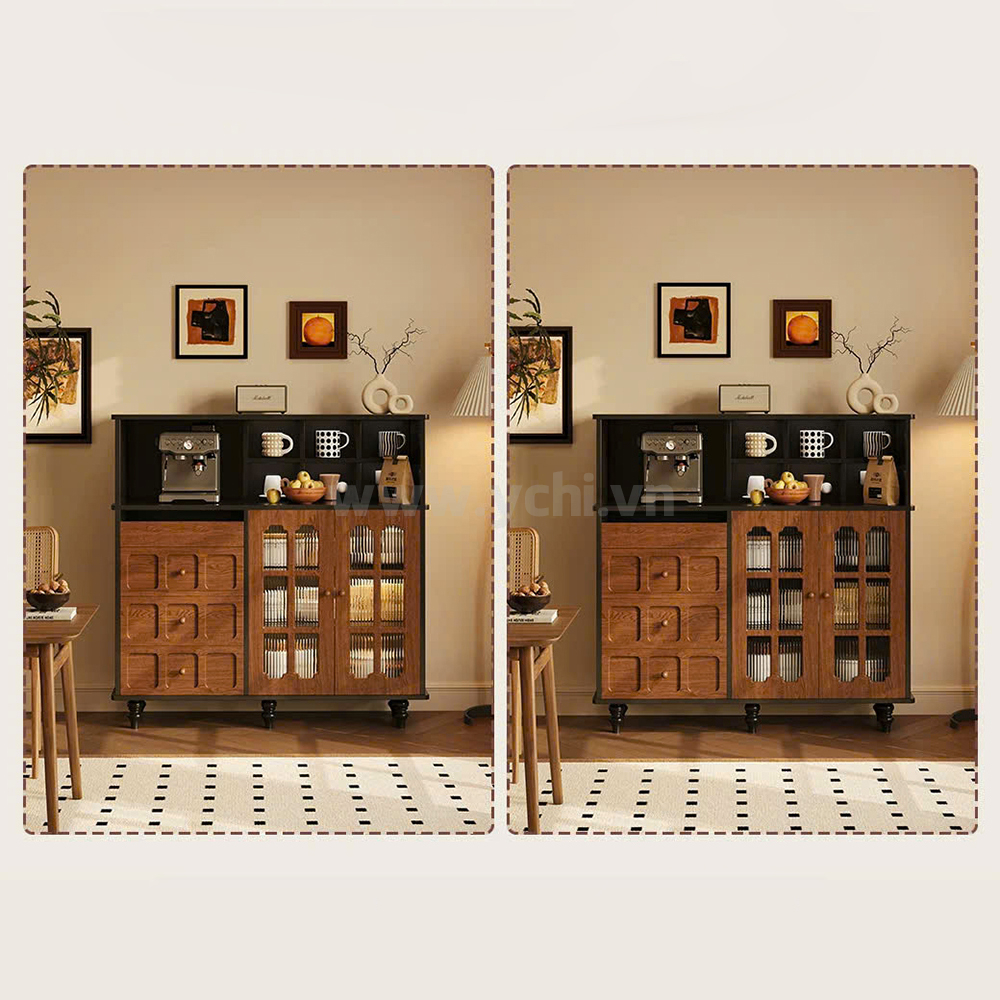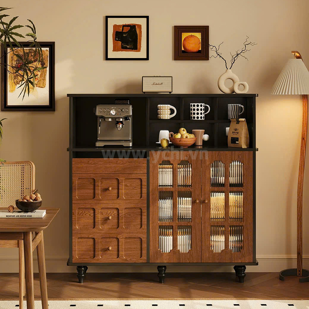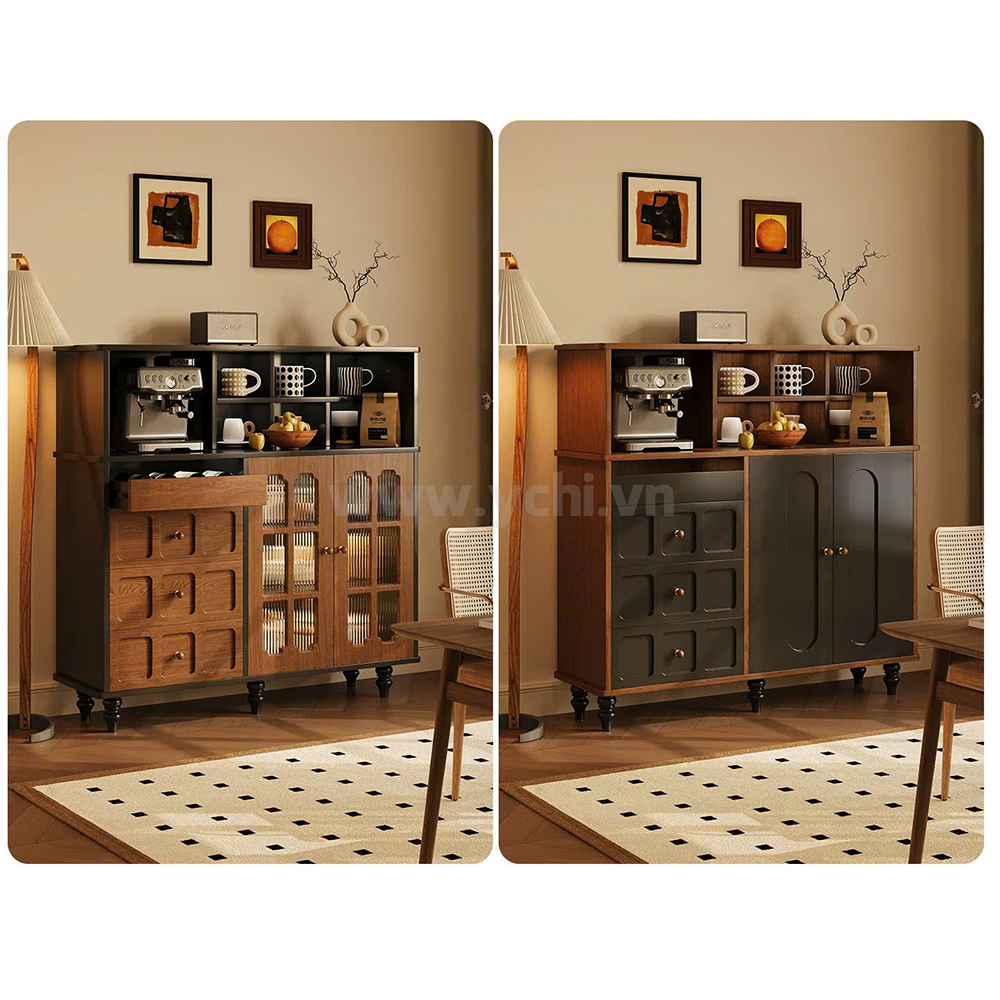 Khám phá sự giao thoa giữa nghệ thuật tạo hình và công năng lưu trữ với Tủ Phòng Ăn Vân Gỗ Tự Nhiên YCHITA011 mang hơi thở đương đại. Được chế tác từ cốt gỗ MDF phủ Melamine bền bỉ hoặc Plywood phủ Veneer thượng hạng, sản phẩm được bảo vệ bởi lớp sơn PU cao cấp, giúp duy trì độ bóng mịn và chống bám bẩn tuyệt đối. Thiết kế gây ấn tượng mạnh với hệ cánh tủ soi rãnh nan dọc tinh tế, tạo nên sự chuyển tiếp mượt mà cho không gian bếp. Điểm nhấn đặc biệt nằm ở khoang trưng bày trung tâm sử dụng kính sọc fluted hiện đại, kết hợp cùng dải đèn LED ẩn tạo hiệu ứng ánh sáng mờ ảo, làm tôn lên vẻ đẹp của những bộ sưu tập ly tách. Tủ tích hợp mặt bàn rộng rãi, là vị trí hoàn hảo để đặt máy pha cà phê hoặc ấm trà, biến góc bếp thành một khu vực thư giãn sang trọng. Hệ thống ngăn kéo và hộc tủ dưới với tay nắm kim loại thanh mảnh cung cấp không gian chứa đồ cực lớn, giữ cho căn nhà luôn gọn gàng. Sản phẩm không chỉ là một vật dụng nội thất mà còn là mảnh ghép nghệ thuật giúp khẳng định gu thẩm mỹ khác biệt và đẳng cấp của gia chủ.
