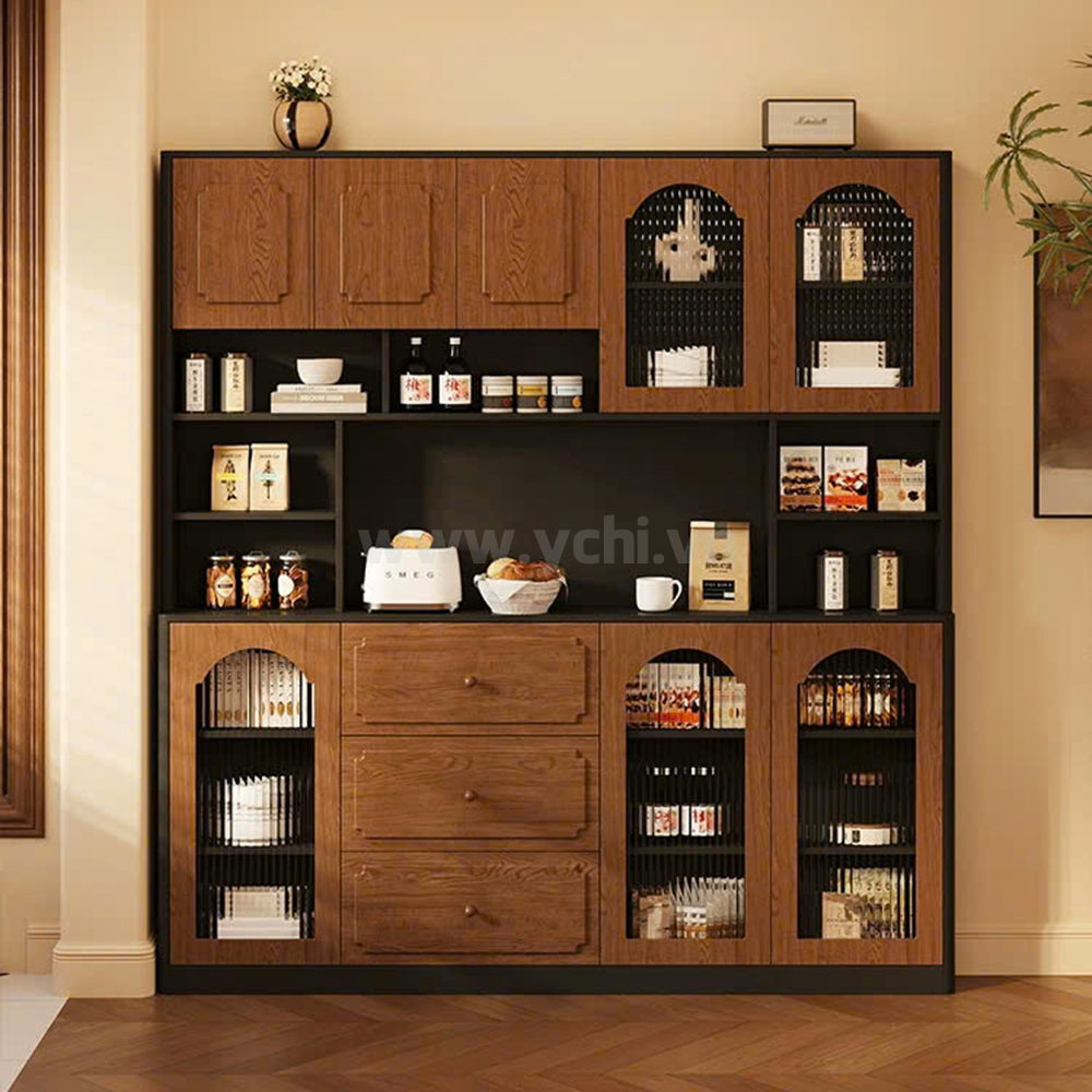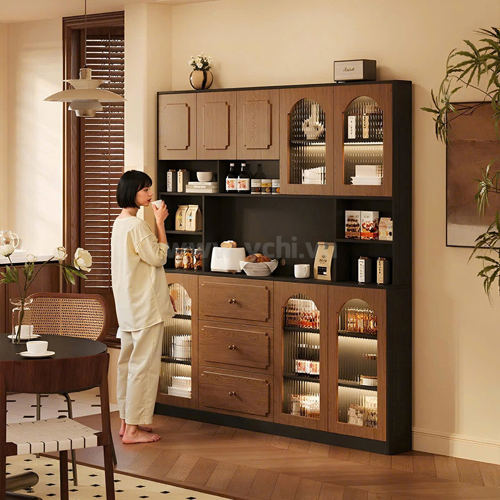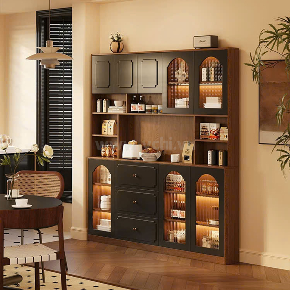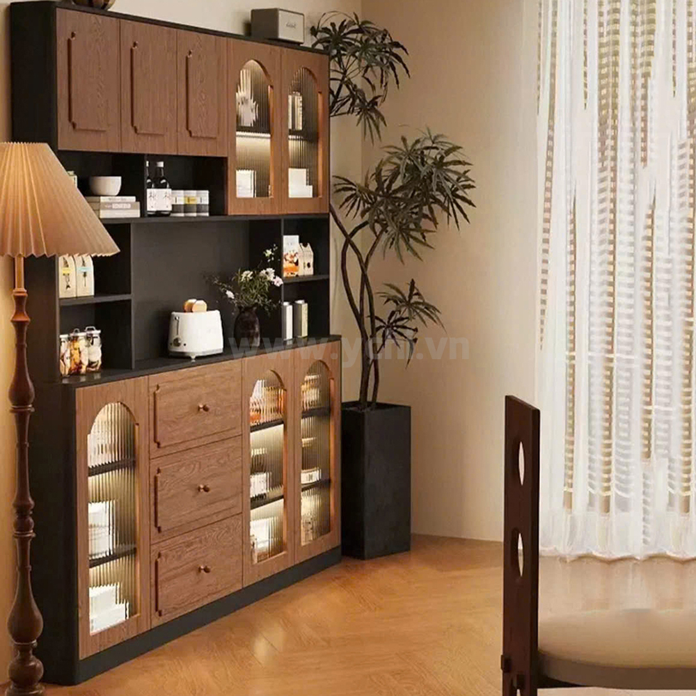 Tủ Phòng Ăn YCHITA015 là sự kết hợp hoàn hảo giữa thiết kế hiện đại, sang trọng và công năng sử dụng tối ưu, làm nổi bật không gian sống đẳng cấp. Sản phẩm được chế tác từ chất liệu gỗ công nghiệp MDF phủ Melamine cao cấp hoặc Plywood phủ Veneer, kết hợp với công nghệ sơn PU giúp bảo vệ bề mặt, chống trầy xước và tăng tính thẩm mỹ. Sản phẩm nổi bật với thiết kế cánh tủ được trang trí bởi các đường nét đẹp mắt, tạo điểm nhấn nghệ thuật và sự tinh tế cho không gian phòng ăn. Tủ được thiết kế gồm nhiều khoang lưu trữ linh hoạt: các ngăn mở dùng để trưng bày ly tách, chai rượu vang và phụ kiện; phần tủ rượu với các kệ nhỏ chuyên dụng giúp sắp xếp rượu ngăn ngập và tiện lợi. Có thể có các hệ thống đèn LED chiếu sáng bên trong tủ không chỉ làm nổi bật sản phẩm trưng bày mà còn tạo không gian ấm cúng, sang trọng. Chất liệu gỗ MDF/Plywood đảm bảo độ bền cao, chống ẩm mốc và mối mọt. Lớp phủ Melamine/Veneer cùng sơn PU giúp tủ giữ được vẻ đẹp bóng đẹp theo thời gian. Mẫu tủ này không chỉ là một sản phẩm nội thất hữu dụng mà còn là một tác phẩm nghệ thuật, mang đến sự sang trọng và đẳng cấp cho ngôi nhà của bạn.