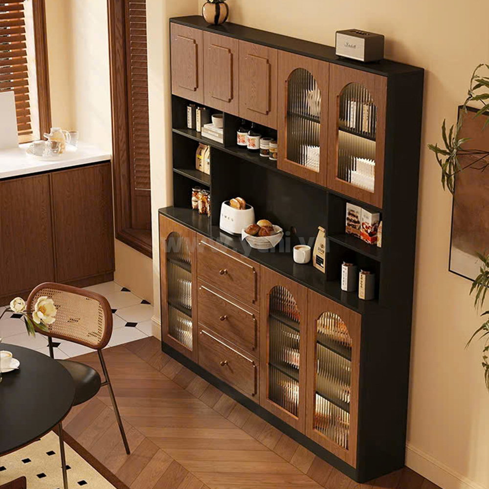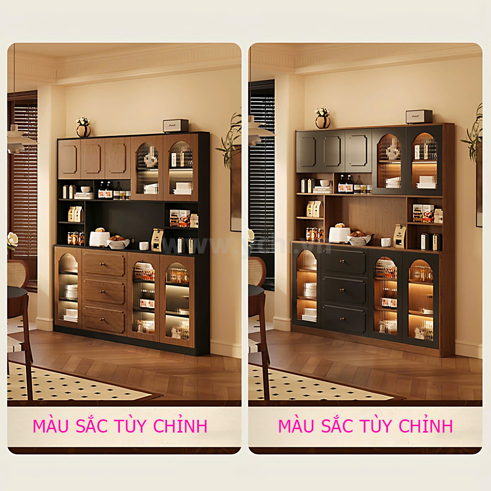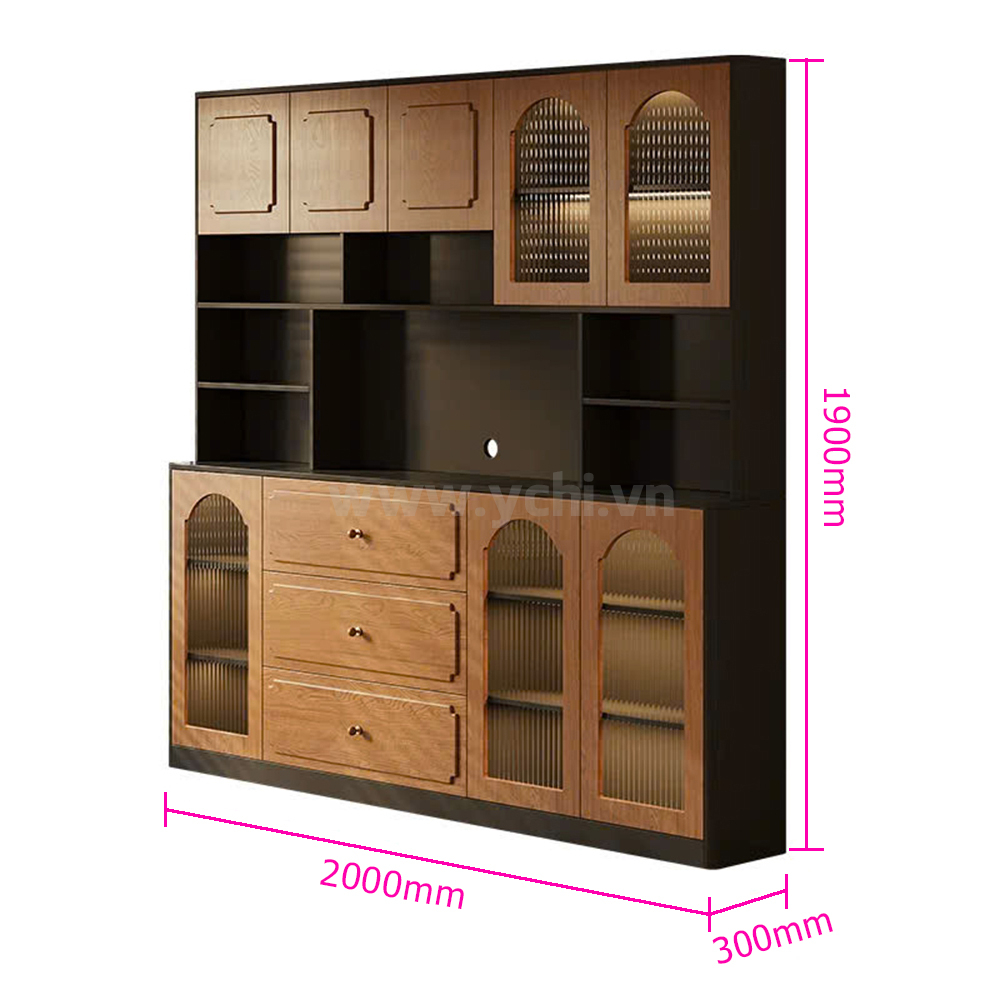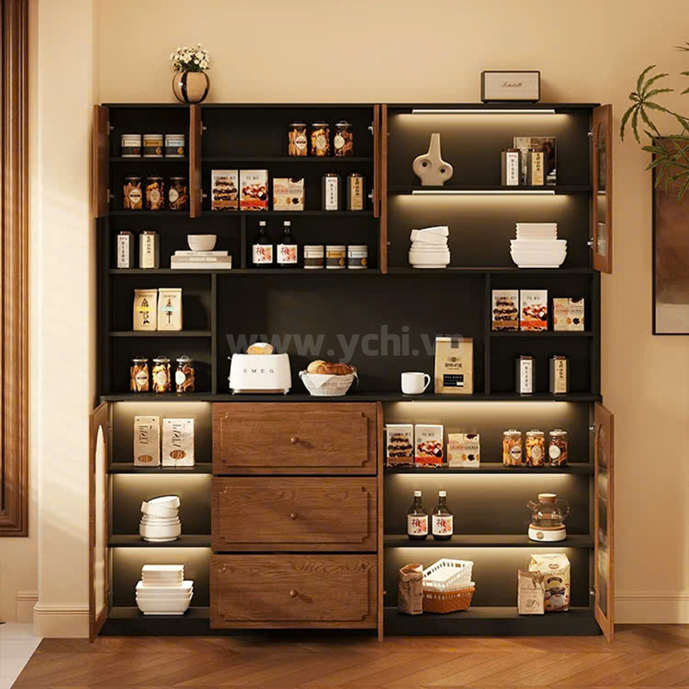 Tủ Phòng Ăn YCHITA015 là sự kết hợp hoàn hảo giữa thiết kế hiện đại, sang trọng và công năng sử dụng tối ưu, làm nổi bật không gian sống đẳng cấp. Sản phẩm được chế tác từ chất liệu gỗ công nghiệp MDF phủ Melamine cao cấp hoặc Plywood phủ Veneer, kết hợp với công nghệ sơn PU giúp bảo vệ bề mặt, chống trầy xước và tăng tính thẩm mỹ. Sản phẩm nổi bật với thiết kế cánh tủ được trang trí bởi các đường nét đẹp mắt, tạo điểm nhấn nghệ thuật và sự tinh tế cho không gian phòng ăn. Tủ được thiết kế gồm nhiều khoang lưu trữ linh hoạt: các ngăn mở dùng để trưng bày ly tách, chai rượu vang và phụ kiện; phần tủ rượu với các kệ nhỏ chuyên dụng giúp sắp xếp rượu ngăn ngập và tiện lợi. Có thể có các hệ thống đèn LED chiếu sáng bên trong tủ không chỉ làm nổi bật sản phẩm trưng bày mà còn tạo không gian ấm cúng, sang trọng. Chất liệu gỗ MDF/Plywood đảm bảo độ bền cao, chống ẩm mốc và mối mọt. Lớp phủ Melamine/Veneer cùng sơn PU giúp tủ giữ được vẻ đẹp bóng đẹp theo thời gian. Mẫu tủ này không chỉ là một sản phẩm nội thất hữu dụng mà còn là một tác phẩm nghệ thuật, mang đến sự sang trọng và đẳng cấp cho ngôi nhà của bạn.