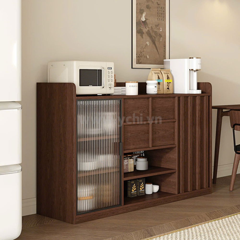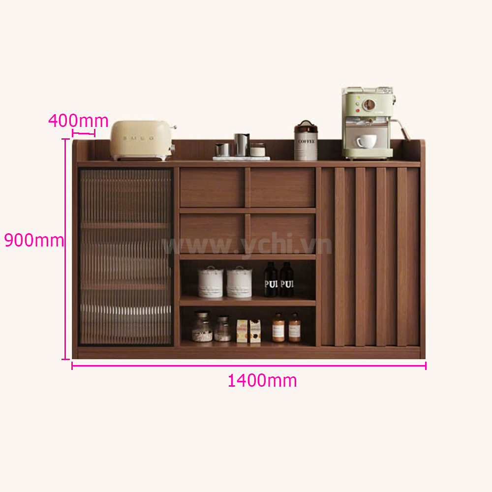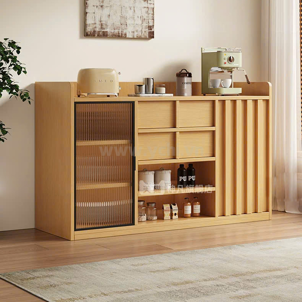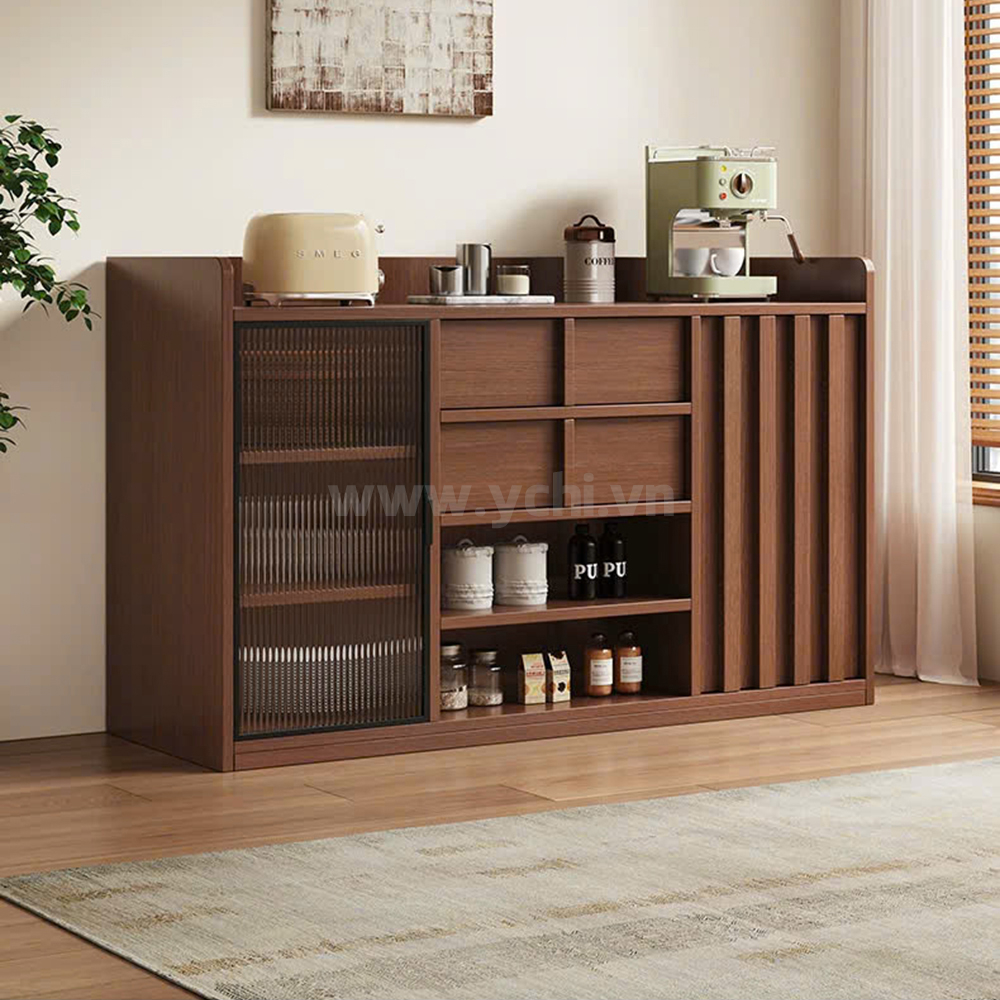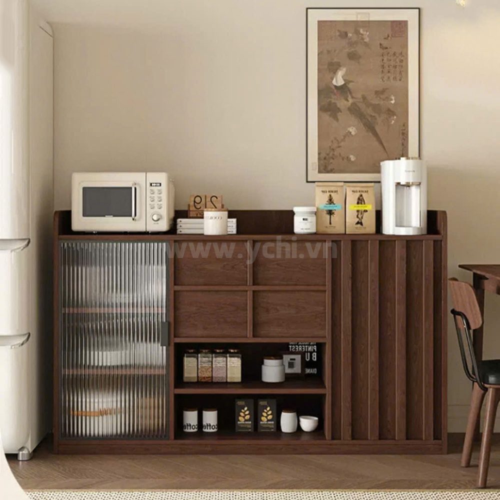 Tủ Phòng Ăn YCHITA041 là sự kết hợp hoàn hảo giữa thiết kế hiện đại, sang trọng và công năng sử dụng tối ưu, làm nổi bật không gian sống đẳng cấp. Sản phẩm được chế tác từ chất liệu gỗ công nghiệp MDF phủ Melamine cao cấp hoặc Plywood phủ Veneer, kết hợp với công nghệ sơn PU giúp bảo vệ bề mặt, chống trầy xước và tăng tính thẩm mỹ. Sản phẩm nổi bật với thiết kế cánh tủ được trang trí bởi các đường nét đẹp mắt, tạo điểm nhấn nghệ thuật và sự tinh tế cho không gian phòng ăn. Tủ được thiết kế gồm nhiều khoang lưu trữ linh hoạt: các ngăn mở dùng để trưng bày ly tách, chai rượu vang và phụ kiện; phần tủ rượu với các kệ nhỏ chuyên dụng giúp sắp xếp rượu ngăn ngập và tiện lợi. Có thể có các hệ thống đèn LED chiếu sáng bên trong tủ không chỉ làm nổi bật sản phẩm trưng bày mà còn tạo không gian ấm cúng, sang trọng. Chất liệu gỗ MDF/Plywood đảm bảo độ bền cao, chống ẩm mốc và mối mọt. Lớp phủ Melamine/Veneer cùng sơn PU giúp tủ giữ được vẻ đẹp bóng đẹp theo thời gian. Mẫu tủ này không chỉ là một sản phẩm nội thất hữu dụng mà còn là một tác phẩm nghệ thuật, mang đến sự sang trọng và đẳng cấp cho ngôi nhà của bạn.